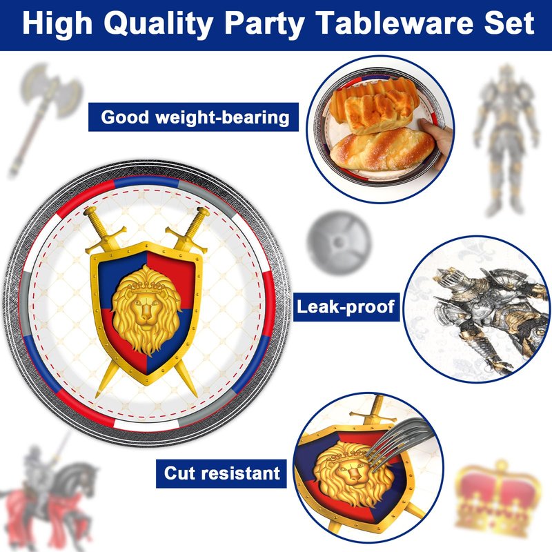 - 【High-Quality Materials】All our Medieval Knights Party Decorations Paper Plates Napkins are made from high-quality thick paper that is safe,odorless,heat-resistant,and durable.The paper plates are soft and have strong absorbency. The prints and colors are beautiful and do not fade easily, making them a favorite among everyone.Please rest assured that safety and quality are our top priorities.