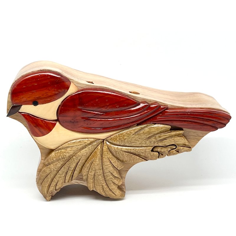 Chickadee Bird Puzzle Box - All Natural Intarsia Wood Puzzle Box - Handcrafted with Secret Compartment