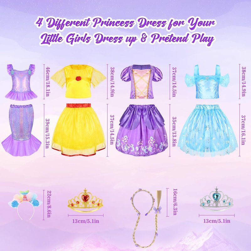 - Let Little Girls to Switch to a Variety of Princess Styles at Will: 4 different themed fairy costume for girls - Little purple mermaid costume, yellow princess costume, purple princess dress and blue princess costume; a shiny crown and a delicate beautiful braid.Get your little girl a set of Chillife princess dress up clothes box with being different princess character every day, add more fresh, stylish and fashion fever to her princess wardrobe.