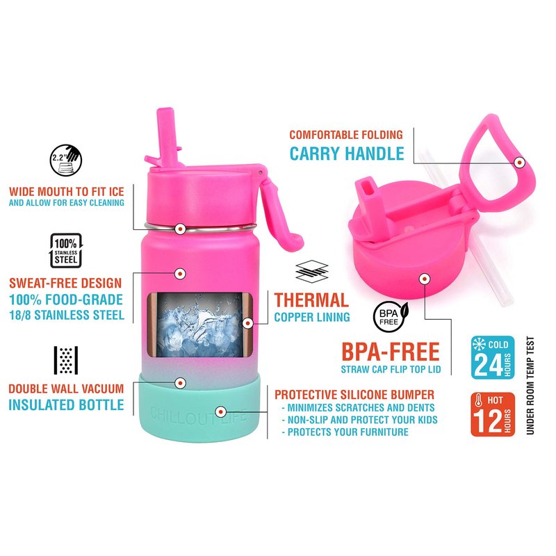 - Your Drink On The Go Has Never Been Better - CHILLOUT LIFE brings you our latest double walled, vacuum insulated, 18/8 stainless steel drinking bottles / Insulated water bottles with a straw for kids, so your cold drinks will stay ice cold for up to 24 hours. Our bottles are BPA free and non-toxic so totally safe for you and your kids to enjoy. Choose between 3 sizes for children and adults and selection of designs to suit your personal preference.