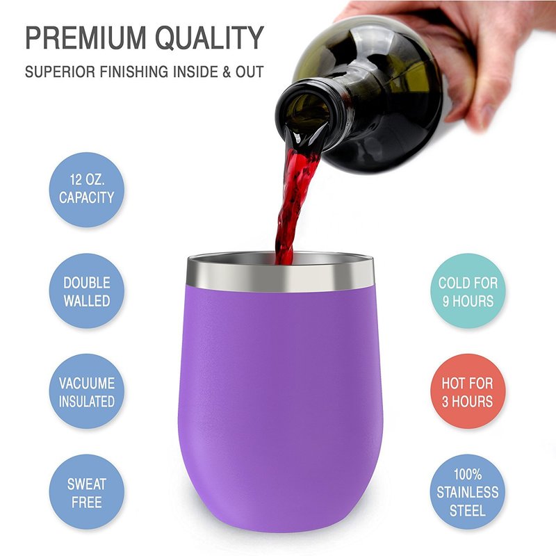 - Double Wall Vacuum Insulated Perfection in a purple wine tumbler made from lifelong Stainless Steel! Set off on your refreshing picnic, hiking or camping adventures with your water, wine, or cocktail icy-cold for 9 hours or your coffee & tea scalding-hot for over 3 hours! It is an insulated stainless steel wine glass with a removable BPA-free lid, designed for sweat-free convenience! Use it as a wine glass tumbler or stick your straw in your refreshing drink through the straw-friendly lid!
