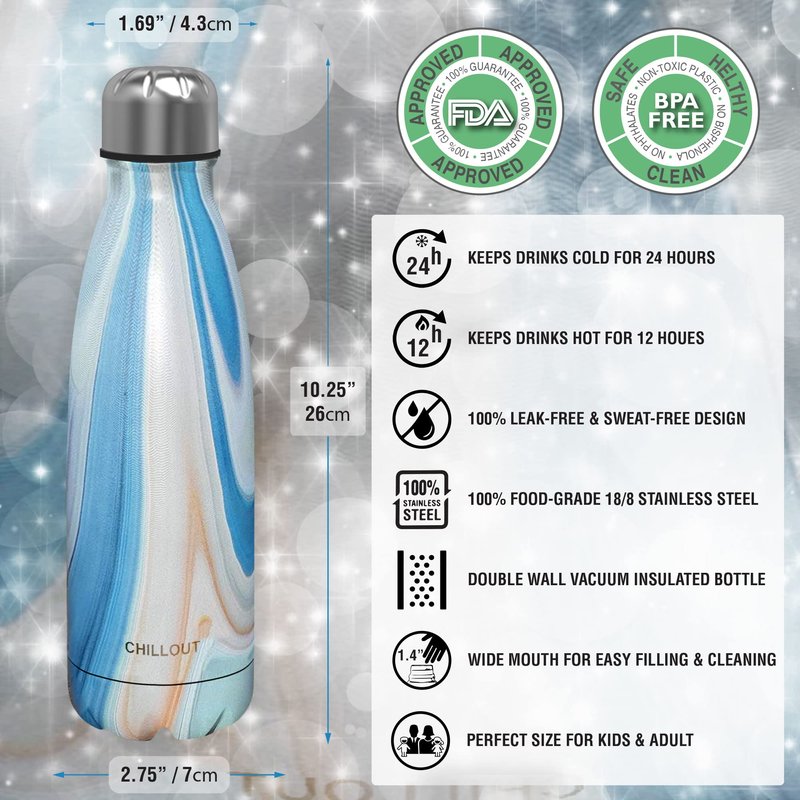 - No More Lukewarm Water: The CHILLOUT LIFE water bottle is made with food grade 18/8 stainless steel that is strong and rustproof for unique durability. The double walled metal bottle is insulated so it can keep your water or juice icy cold for up to 24 hours and your coffee, tea or cocoa warm for up to 12 hours! The drinking bottle is bpa-free and non-toxic so it can be eco-friendly and perfectly safe for you and your kids.