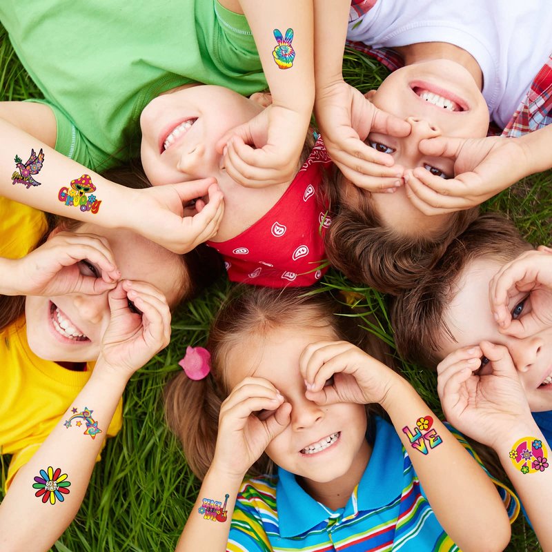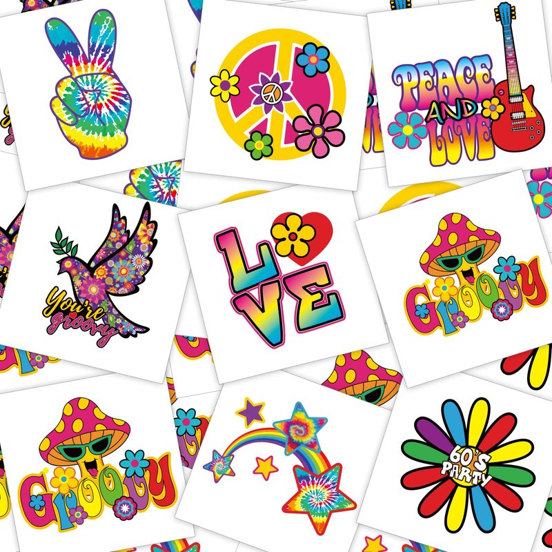 Chinco 144 Pcs Hippie Temporary Tattoo Stickers 70s 80s 90s Party Favor Groovy Hippie Tattoos Waterproof Hippie Face Tattoos Love and Peace Sign Temporary Tattoos Decals for Tie Dye Hippie Party Favor