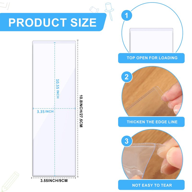 - Applicable Cards: the outer size of clear adhesive pockets is 27.5 x 9 cm/ 10.8 x 3.55 inches, fits cards up to 10.55 x 3.35 inches; You will recieve 30 self-adhesive card holder for labels, waterproof, dustproof, and fingerprint-resistant