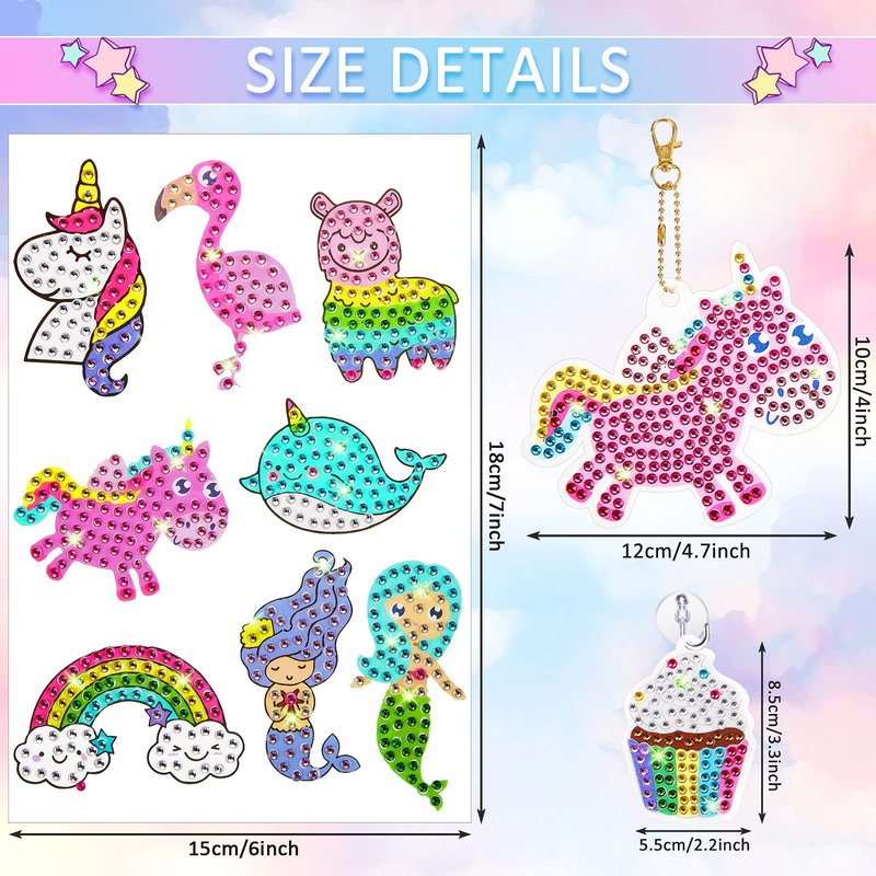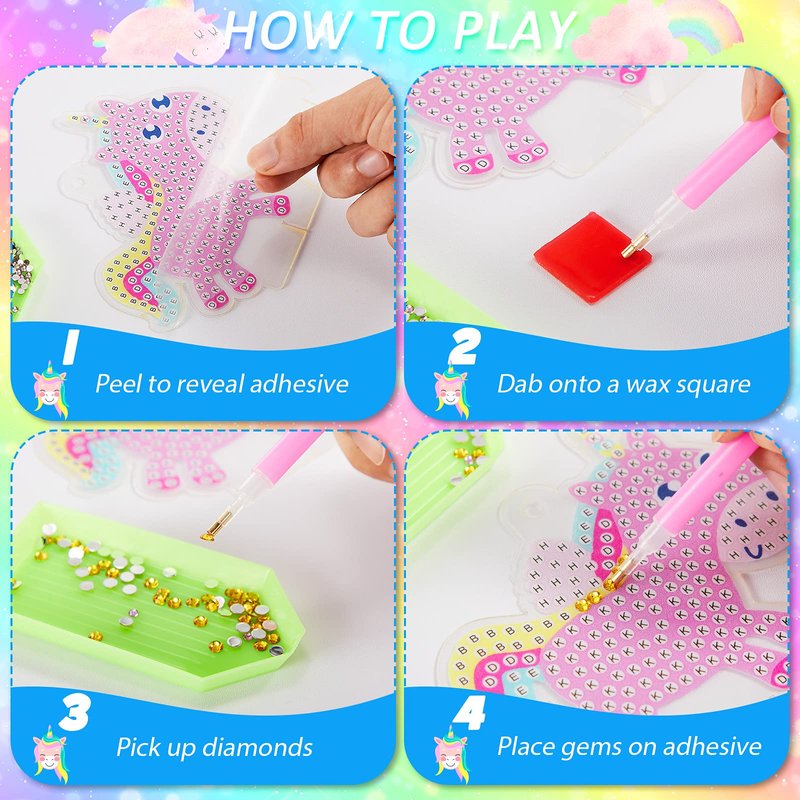 Features: Favorable activity to train hand-on skills:Diamond painting is a favorable activity to enhance hand-eye coordination, imaginative expression, fine motor skills and self-confidence.Simple to assemble:No glue is needed, you can just place gems in positions that marked the corresponding color with the diamond painting tool, and the plastic gem tray helps to keep you organized. Once finished, it's also easy to paste anywhere you want to decorate.Package includes:24 x Diamond art stickers2 x Suncatchers1 x Diamond painting pen1 x Tray2 x Wax squares1 x Suction cup1 x KeychainMore than 1000 pieces of diamonds gemsDiamonds are indivisible and inedible, please keep away from baby.Manual measurement, please allow slight errors on size.