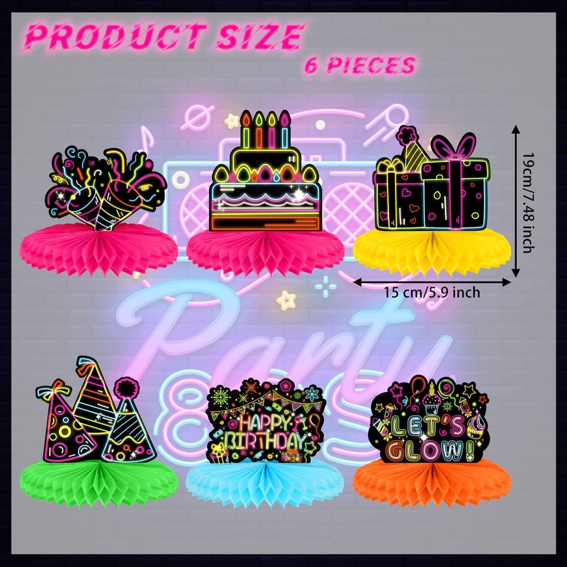 - Birthday combinations: you will receive 6 pieces of neon birthday decorations in different styles, designed with honeycomb bottoms, printed with balloons, stars, gift boxes, stars and other classic elements, full of party atmosphere, ideal choice for decorating your party