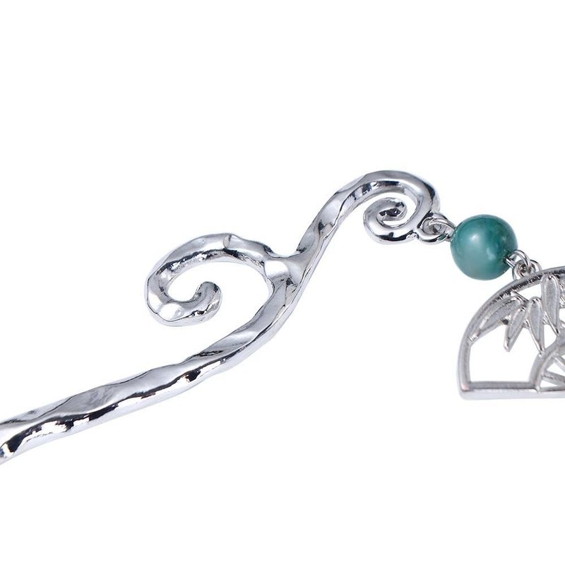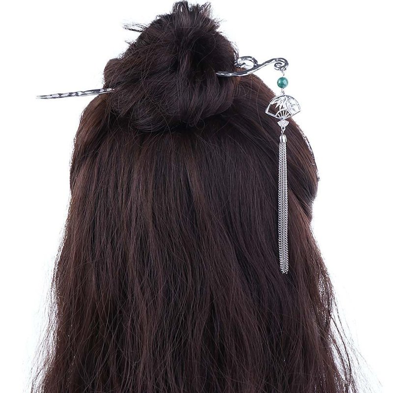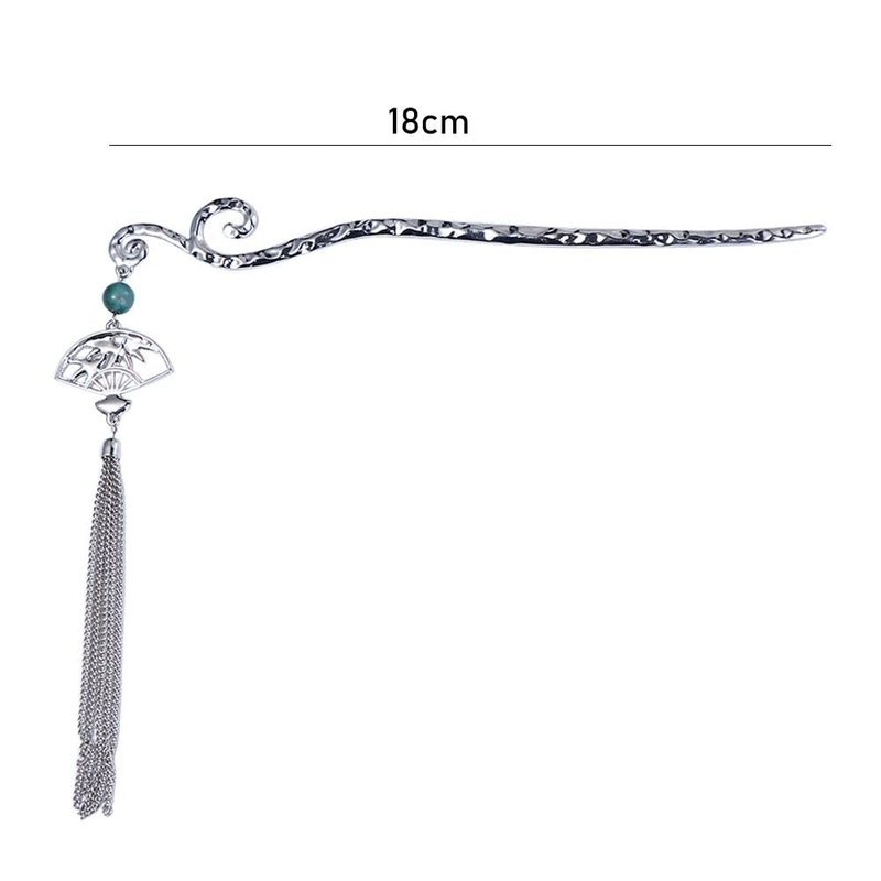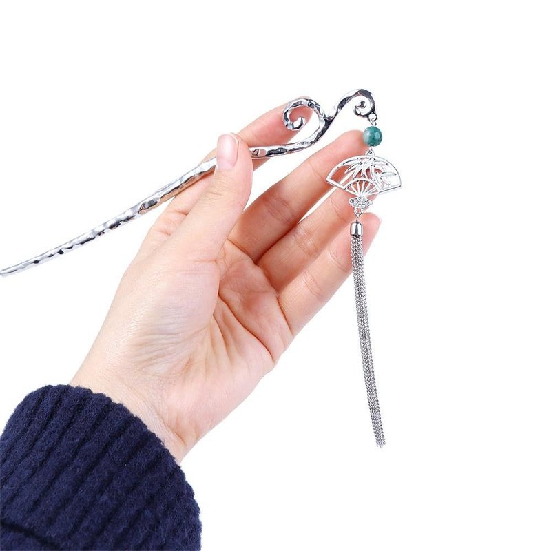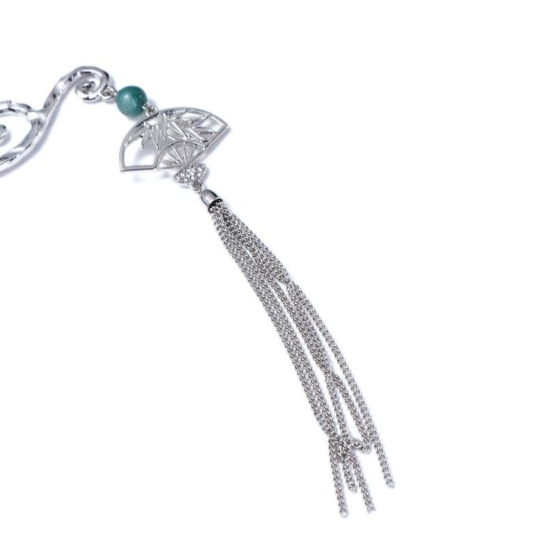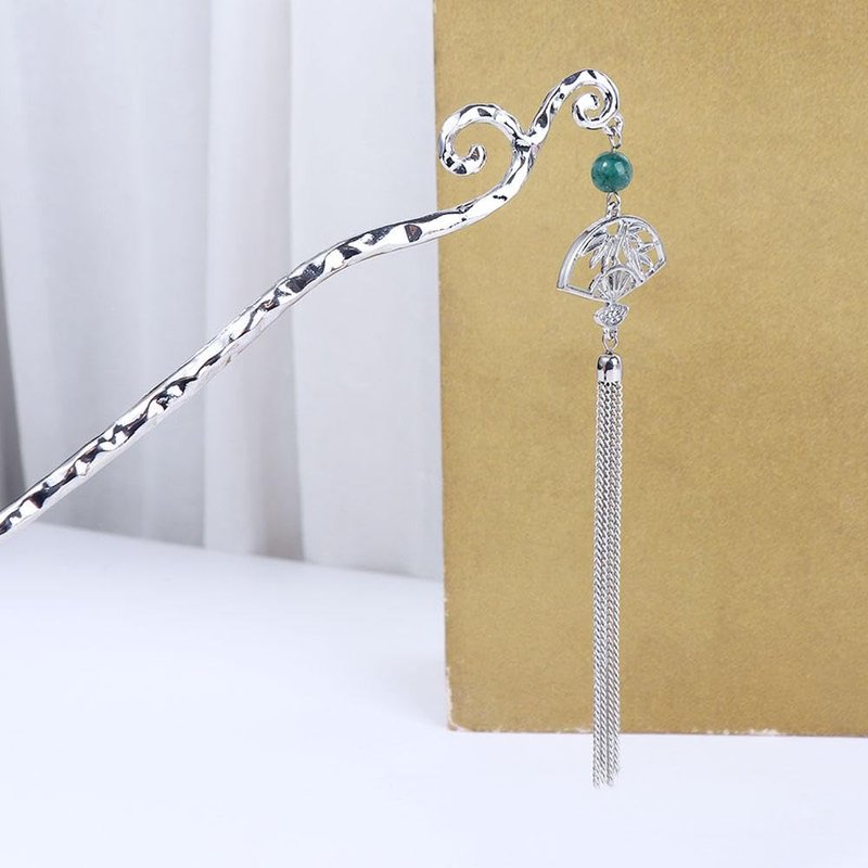 Chinese Style Hair Stick Retro Metal Hairpin Long Tassel Hair Fork Green Bead Fan Hair Stick Hanfu Headdress Hair Accessories for Women Girls