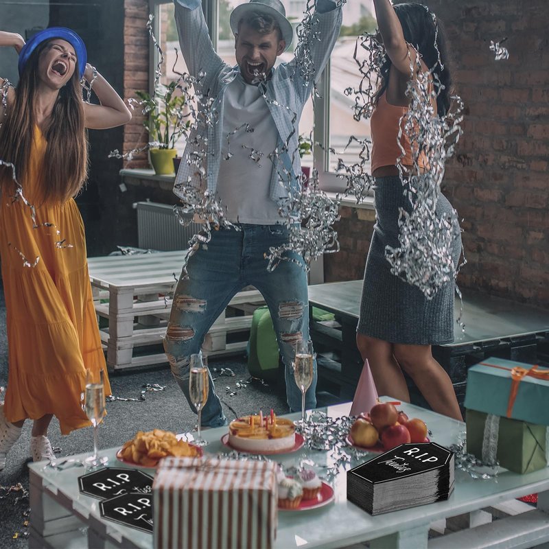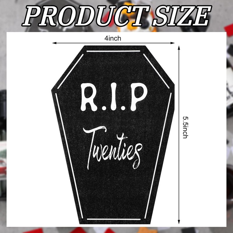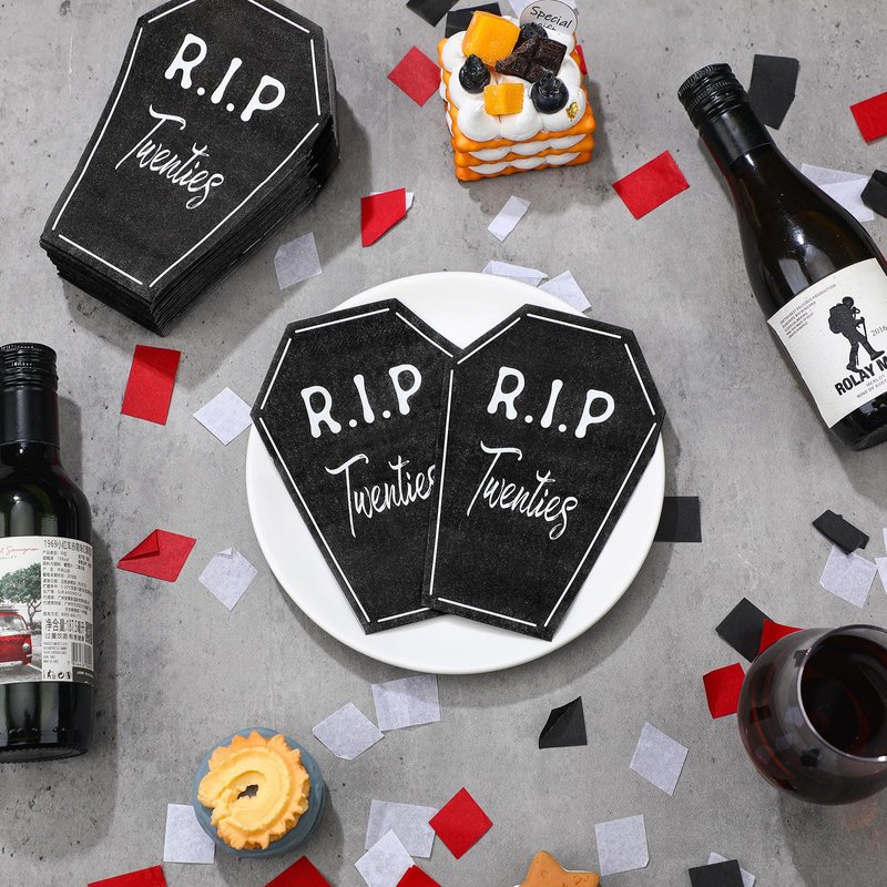 - Dark Elegance: black and white cocktail napkins for rip to my 20s birthday decorations are eye catching and cool, enhancing the party ambiance; Printed with [R. I. P Twenties] and designed in tombstones shape, they not only keep the table clean, but also blend ideally with the other decorations