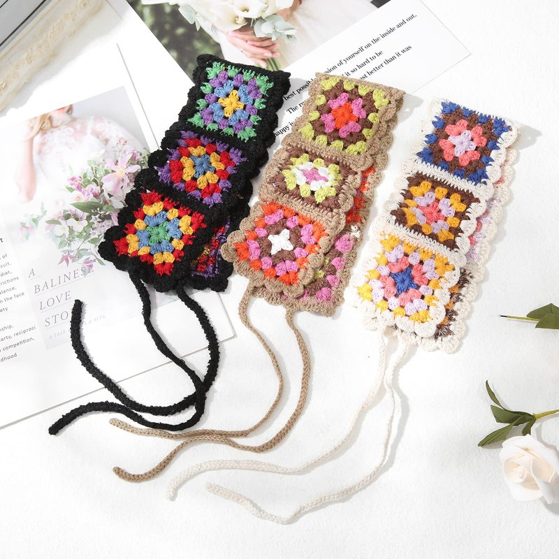 CHLINS Hairband, 3PCS Crochet Headband Women Floral Hairband - Elastic Handmade Crochet Head Wrap Bohemian knit Headband for Women and Girls (Square, Black + Beige + Khaki)