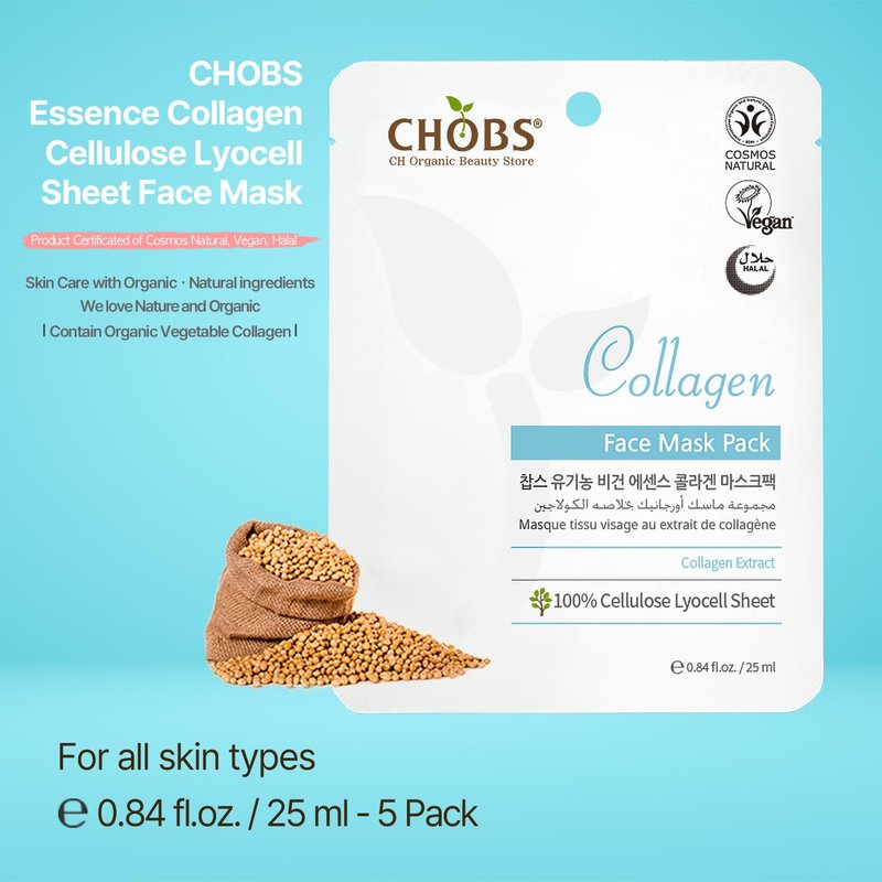 Indulge in the luxurious experience of CHOBS Collagen 5 Pack Biodegradable Cellulose Lyocell Sheet Face Mask. This pore minimizing, elasticity-improving, and deep moisturizing mask is a true gem in the world of Korean skincare. Crafted from certified vegan and natural plant-based materials, it offers a gentle yet effective solution for achieving a radiant complexion. Treat your skin to the nourishing goodness of this premium face mask and unveil a refreshed, youthful glow. Embrace the power of nature with this 5-pack of biodegradable cellulose lyocell sheet masks.