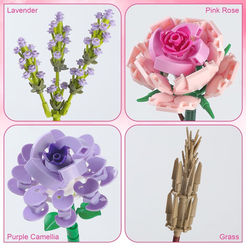 - Rich Details: Made of 393 pieces, delivered a vibrant display of colors and interesting shape, inspired by real flowers Pink Rose, Lavender, Hydrangea, Eustoma, ect. Please note that it is not compatible with standard bricks and vase is NOT included