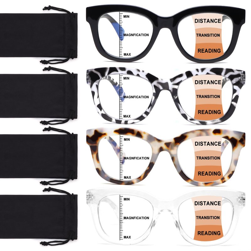 - 【Excellent Value for Money】4 pairs of progressive multifocus reading glasses have its own cases and a cleaning cloth,you can place a pair of glasses anywhere,so you always have them handy,the combination of four colors suitable for any clothing and style also good gifts for friends and family members