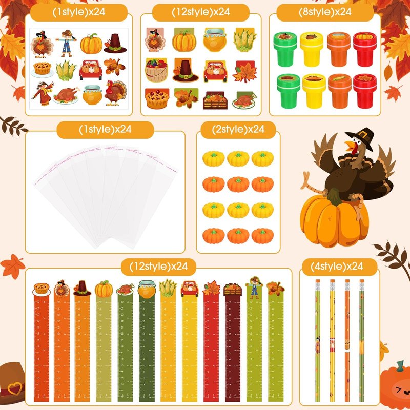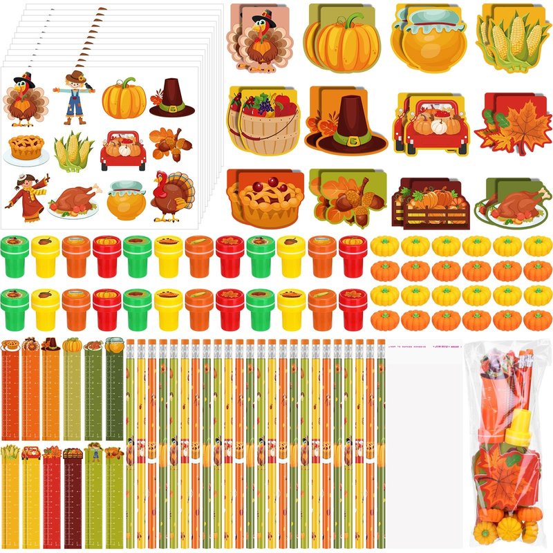 - Package Contents: the Thanksgiving themed stationery set includes 24 pieces Thanksgiving stampers, 24 pieces Thanksgiving mini notebooks, 24 pieces Thanksgiving erasers, 24 pieces Thanksgiving stickers, 24 pieces Thanksgiving pencils, 24 pieces Thanksgiving rulers, coming with 24 sets of clear gift bags, abundant in quantity, meeting your different decorative needs, enough to share with your mates