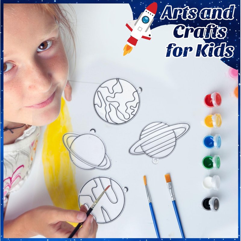 - Planet Decorations: each package comes with 24 pieces planet painting sun catchers in 8 different styles, 24 pieces suction hooks, 12 colors of paints, 4 pieces brushes, 1 roll of fishing thread; They are nice combinations and allow you to create your planet themed suncatchers