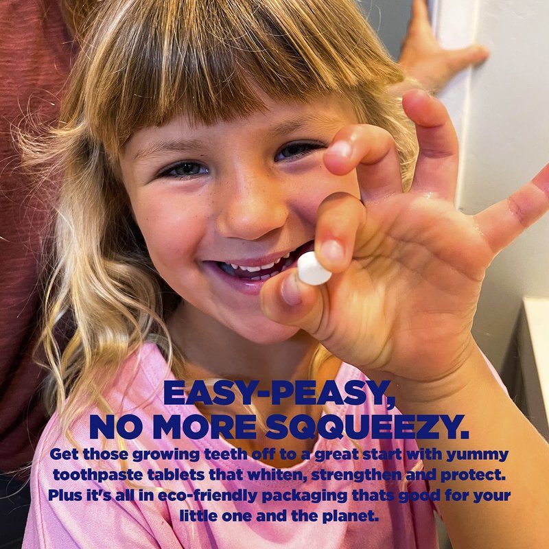 All Natural Very Berry Kids Toothpaste Tablets — Kid friendly, teeth friendly. And best of all....parent sanity saving. Skip the usual toothpaste battle with yummy, yet powerfully effective toothpaste tablets made for kids. Comes in an eco-friendly, fully compostable paper bags. Just pop a tab in your mouth, chomp down, swish, & brush. Repeat twice a day as you normally would with tube toothpaste. Not recommended for children under 6 years old due to potential choking hazards.