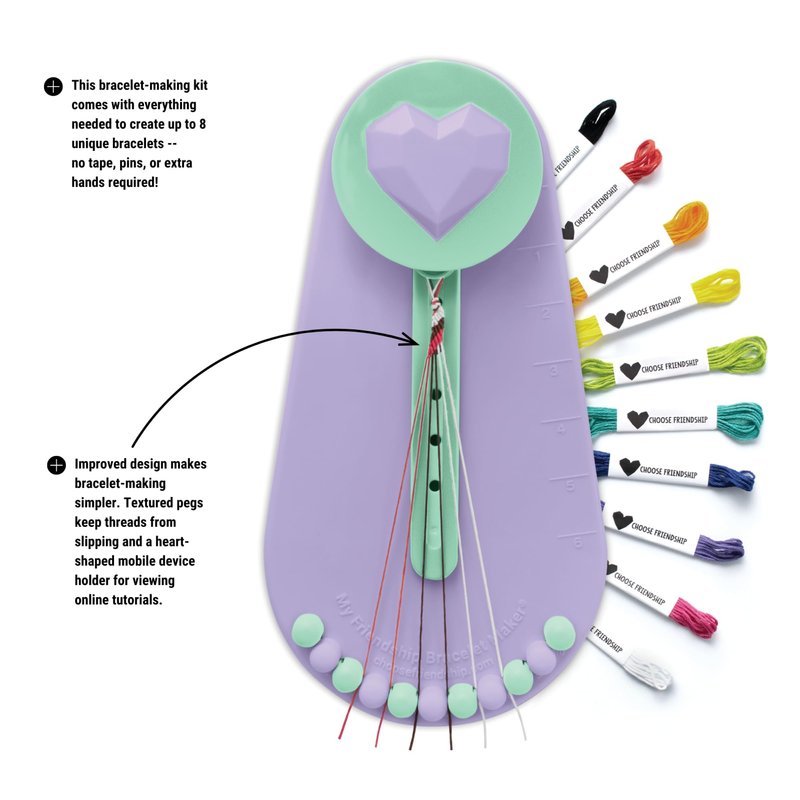 - 🎨 Simpler Crafting with Updated Design: Improved design makes bracelet-making simpler. Textured pegs keep threads from slipping and the heart-shaped mobile device holder simplifies viewing online tutorials.