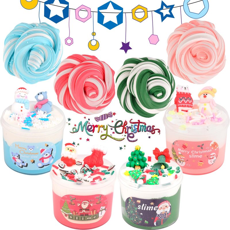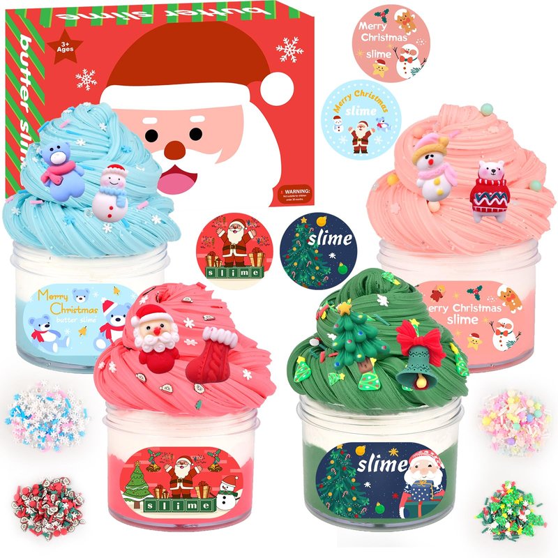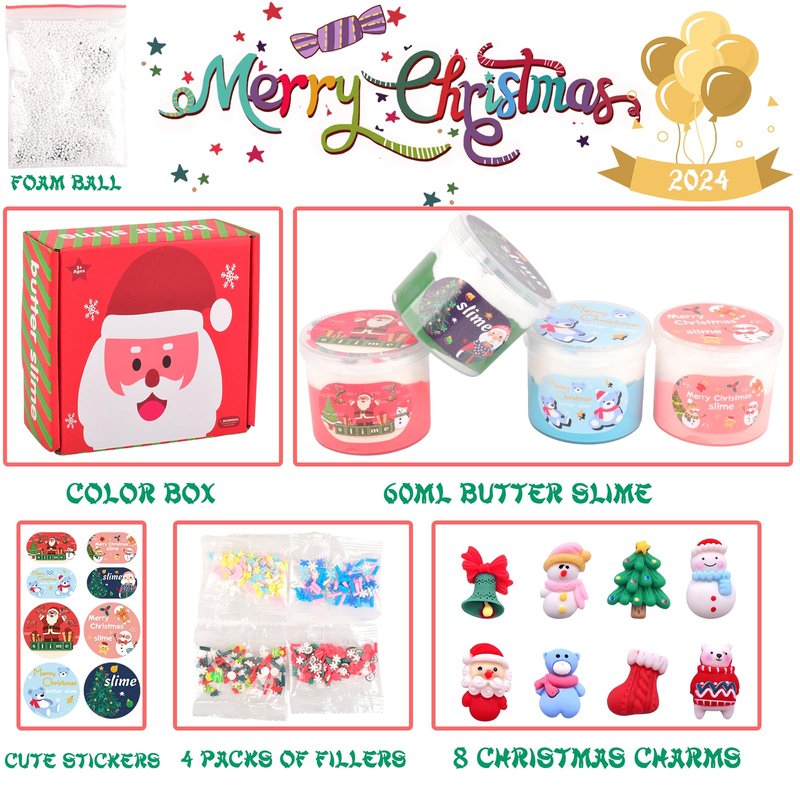 - CHRISTMAS : You will receive a mini beautiful color box containing four two tone butter slimes (which is a great Christmas stocking filler), 8 cute Christmas charms, and a sticker, making it a great Christmas toy