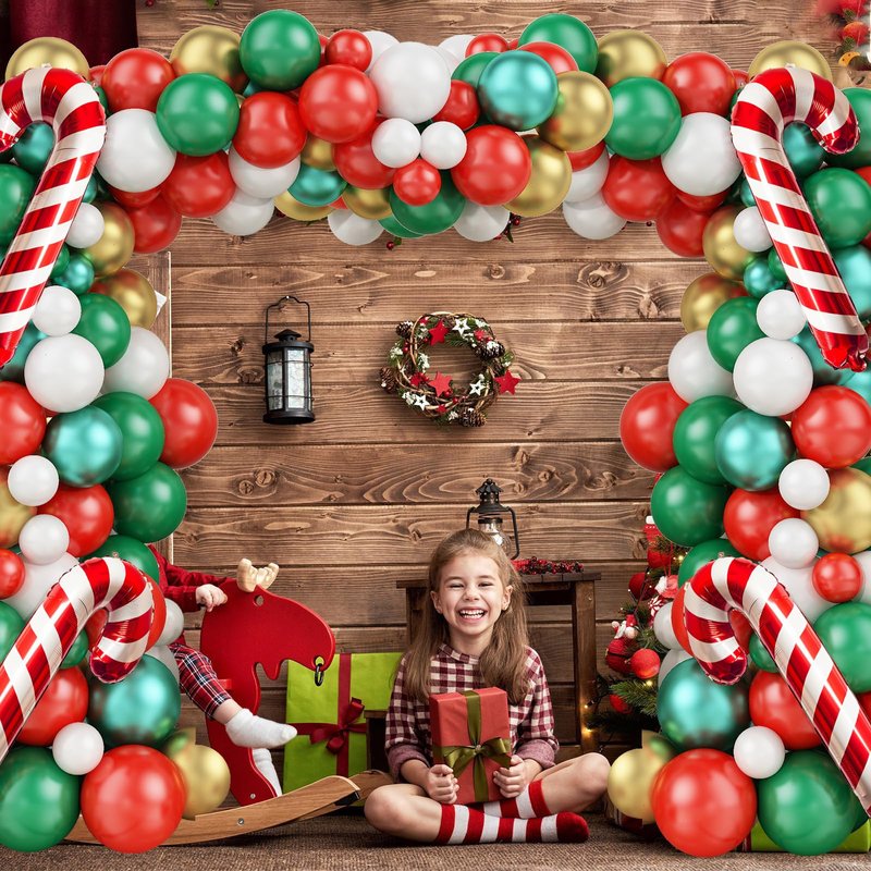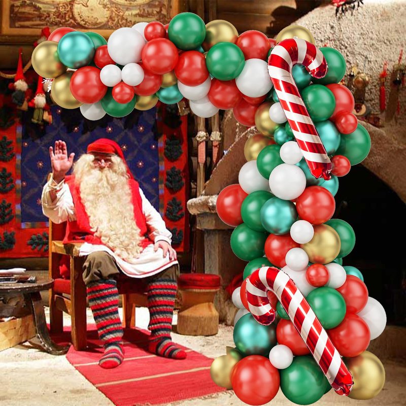 - 🎁【Package Includes】: Christmas balloon arch set contains: 1 x elf foil balloon, 2 x cane foil balloons, 10 x 5-inch metallic green balloons, 10 x 10-inch metal gold balloons, 20 x 10-inch dark green balloons, 15 x 10-inch red balloons, 15 x 10-inch white balloons, 10 x 12-inch red balloons, 10 x 12-inch dark green balloons, 10 x 5-inch red balloons, 10 x 5-inch white balloons, 1 x balloon chain, 1 x dot glue.