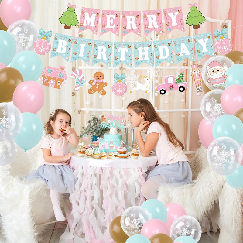 - Your kit comes with 1Pc “MERRY BIRTHDAY” banner, 1pc cute Christmas banner, 12pcs Christmas Cupcake Toppers, 1Pc “merry birthday” Cake Topper, 28Pcs Latex Balloons (pink, cocoa brown , t-blue, snowflakes balloons). Adding this unique merry birthday banner decoration to display the precious and meaningful memories of your baby during Christmas birthday party