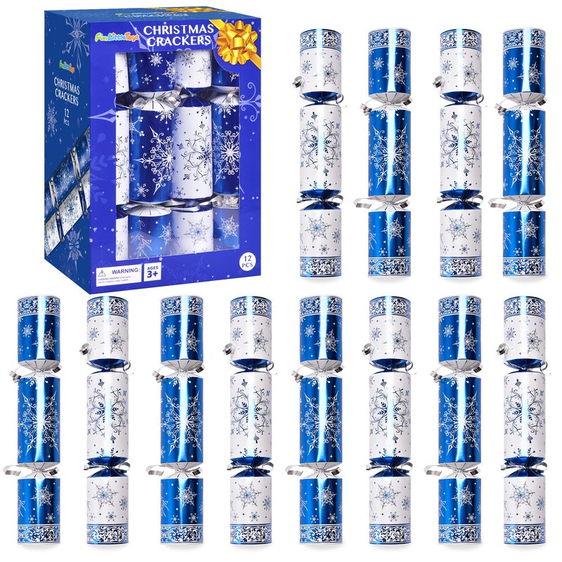 Christmas Crackers, 12 Pack Valentines No Snap Party Favors with Party Hat, Joke & Little Gift Inside for Christmas Thanksgiving Seasonal Holiday Dinner Traditions (Blue and White)