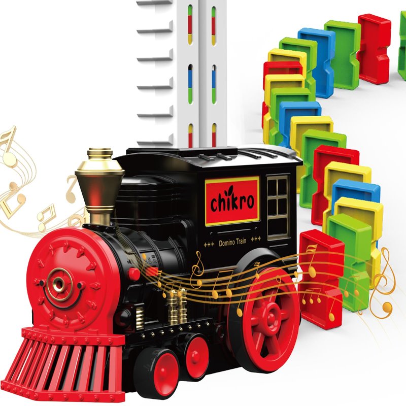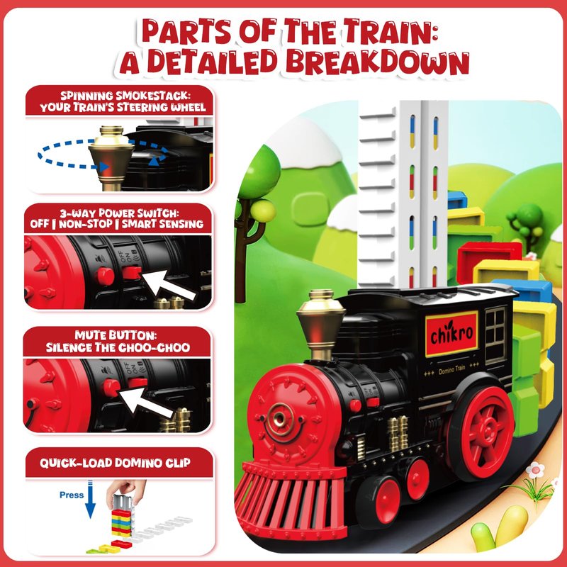 - Genius 2-in-1 Funnel System: Load dominoes like a pro! Fixed part on the train, detachable part on the ground. Fill the ground funnel, give it a press, and voila! Dominoes slide right into the train's dispenser. It's like magic, but it's pure engineering awesomeness!