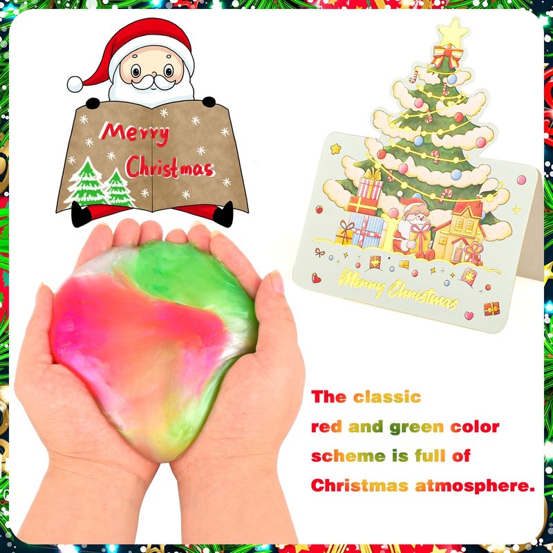 - [Mini Christmas Slime]:The slime’s classic color combination of red, green and white is full of Christmas spirit, and the Christmas greeting card it comes with sends full Christmas blessings to children