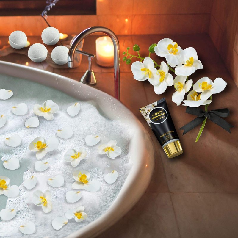 - SHOW YOUR LOVE 12 PIECE GIFT SET ♥ This spa gift basket has everything a woman needs! 7 stems of White Orchid Soap Flowers, White Orchid Hand Lotion and 4 Bath Bombs. The gift set is wrapped and ready to give on any occasion