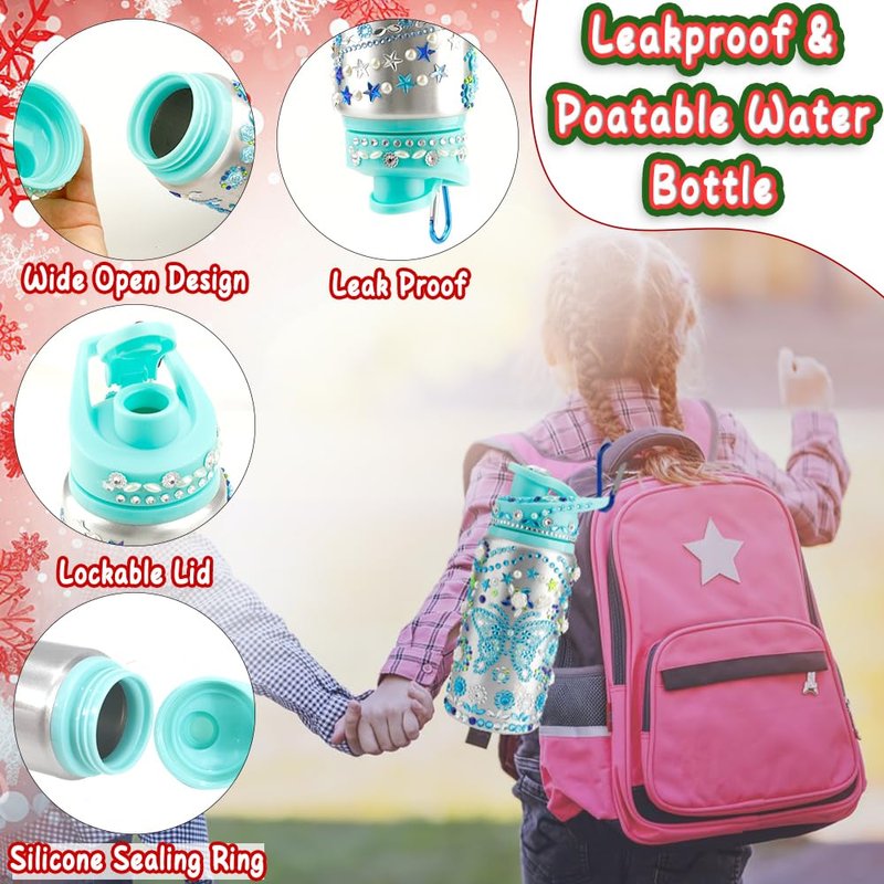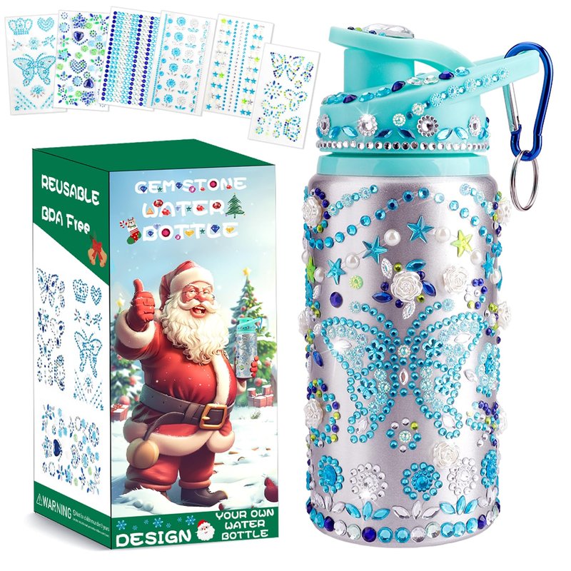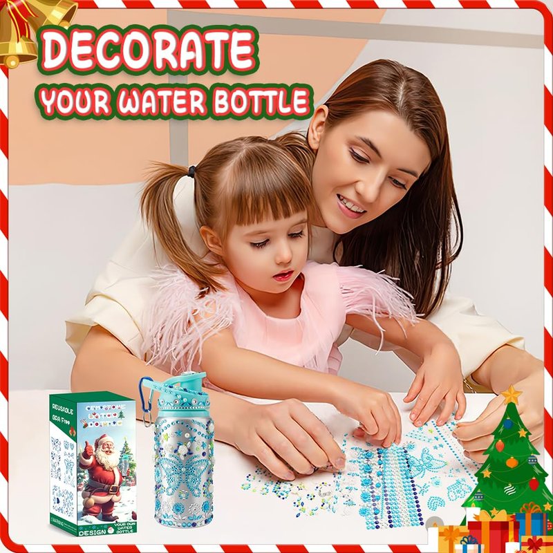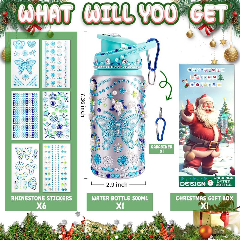 - Decorate Your Own Water Bottle Kit: This water bottle gem craft kit inckuding 1 pcs 500ml stainless steel water bottle, 6 sheet of rhinestone stickers, 1 pcs carabiner and 1 pcs operating instructions in a Christmas gift box, enough gem stickers for children to fully utilize their creative abilities, great choice as christmas stocking stuffers