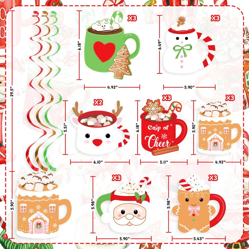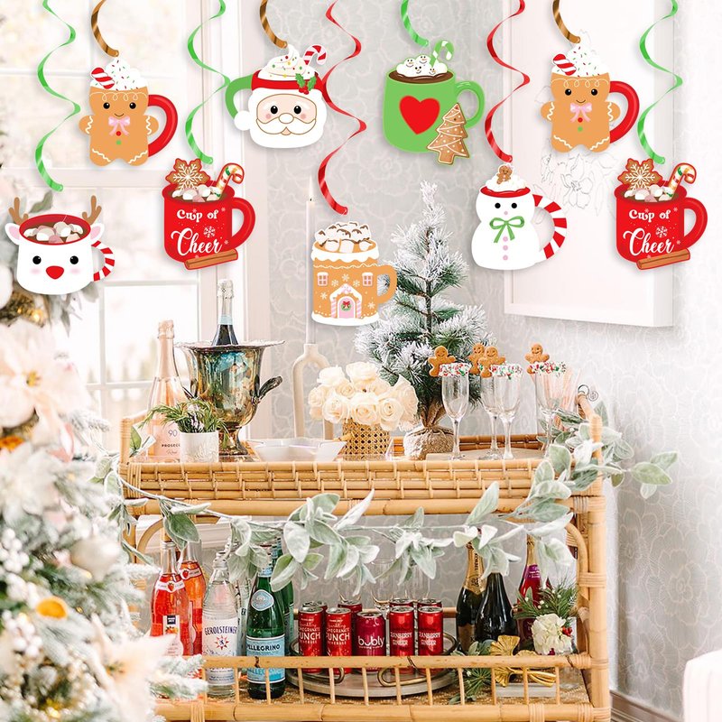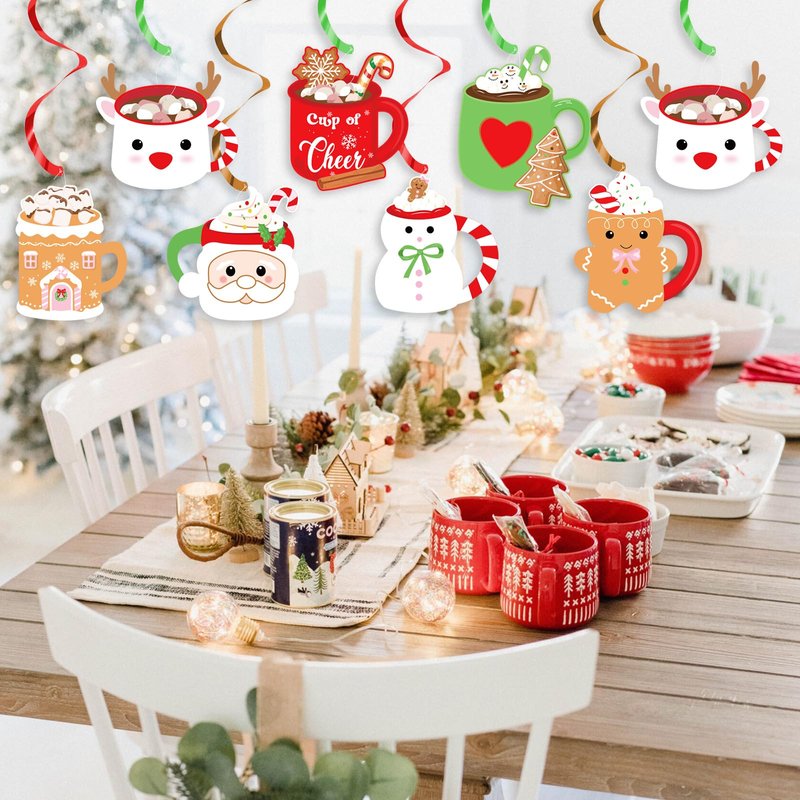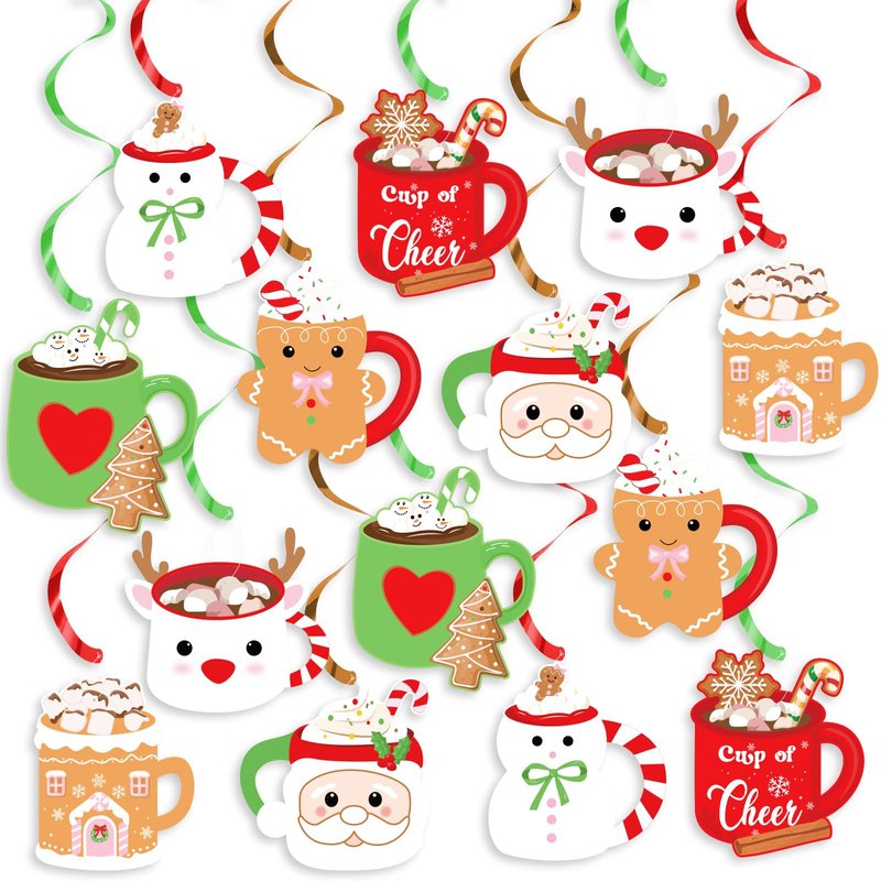 Christmas Gingerbread Mug Cocoa Bar Hanging Swirls Decor, 20Pcs Snowman Elk Santa Coffee Mug Hot Cocoa Bar Ceiling Hanging Streamers Decorations for Christmas Bday Baby Shower New Year Party Supplies