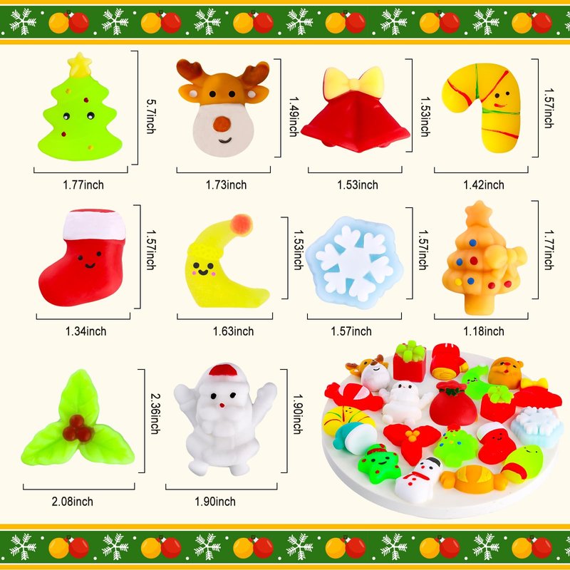 - Christmas Squishies Toy Set: This Squishies set includes 36 different styles of Christmas party favor toys, have multiple Christmas elements, such as Christmas tree, Snowman, Santa Claus, Reindeer, Christmas Stockings, Candy etc.