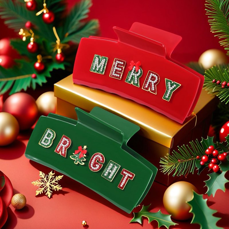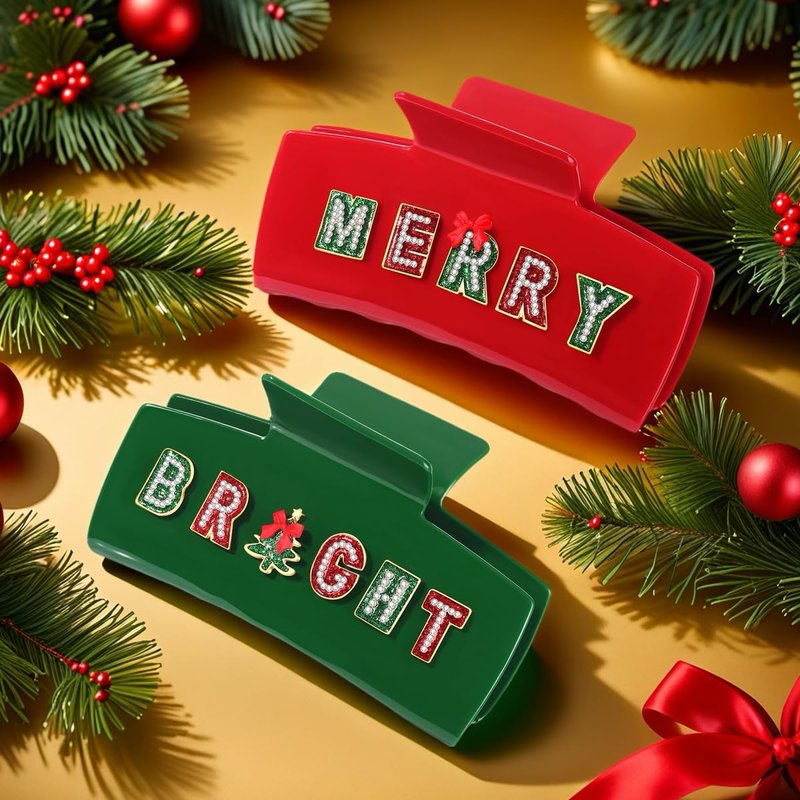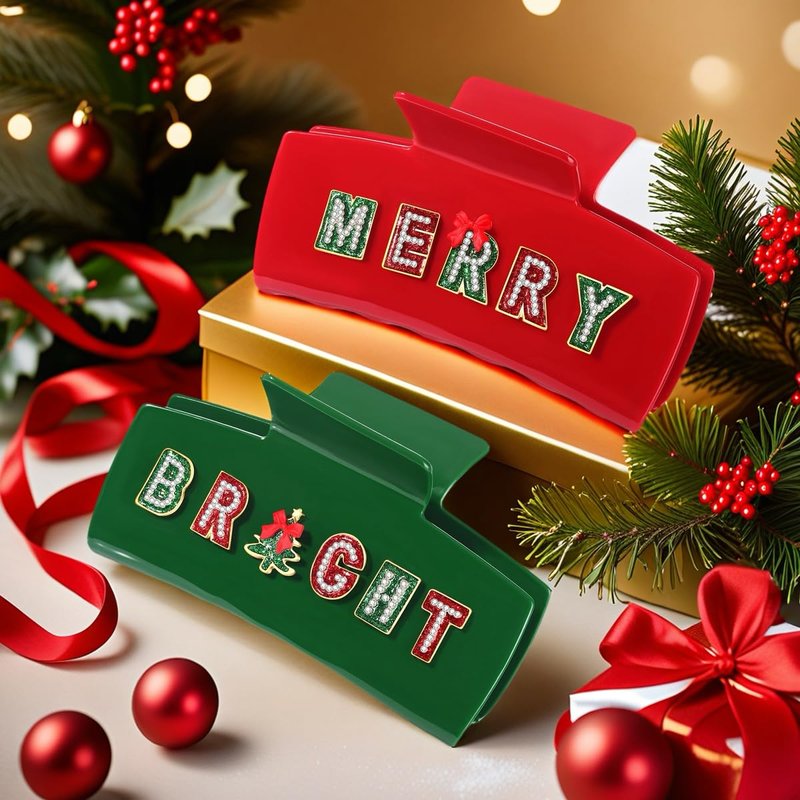 - ღ Christmas Hair Claws: Get into the festive spirit with our Christmas Hair Clips Set. This set includes two beautiful Christmas Hair Claws boating vibrant red and green colors, adorned with rhinestone bold letter ‘MERRY’/’HOLLY’/’HOHOHO’/’MERRY BRIGHT’/Christmas Lights/Christmas Tree, captures the essence of Christmas and spreads holiday cheer