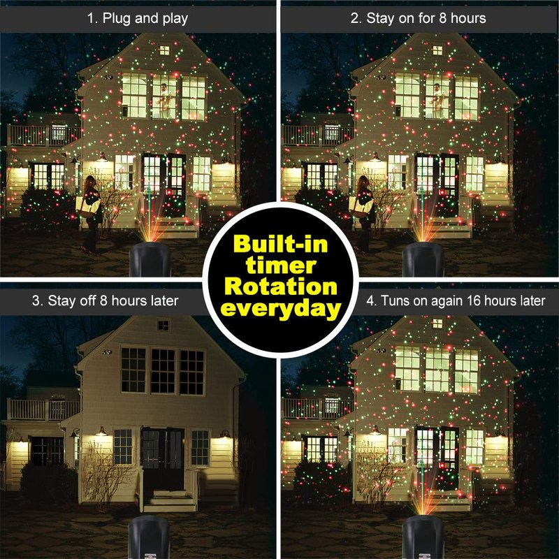 - π Easy To Use - To use this Christmas laser light show, simply connect it to electricity and play. With the built-in timer, it turns off automatically 8 hour later and, it turns on again automatically 16 hours later.