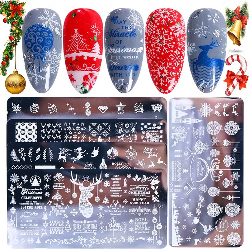 Christmas Nail Stamping Plates, 5Pcs Christmas Nail Stamper Kit Snowflakes Xmas Tree Bell Snowman Elk Nail Art Stencils Plates Winter Nail Stamp Kit Manicure Template Design Tool