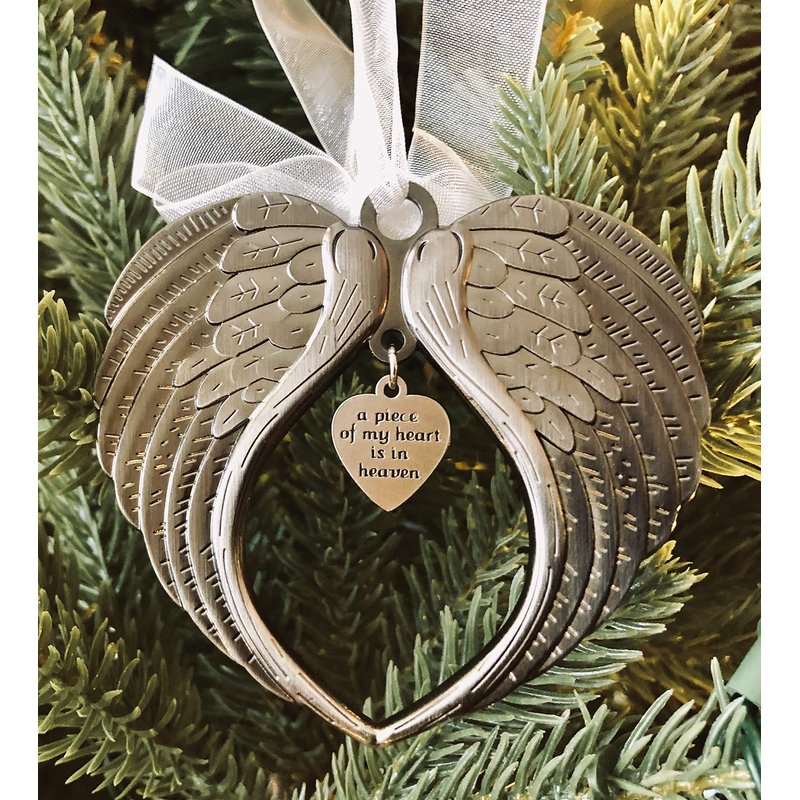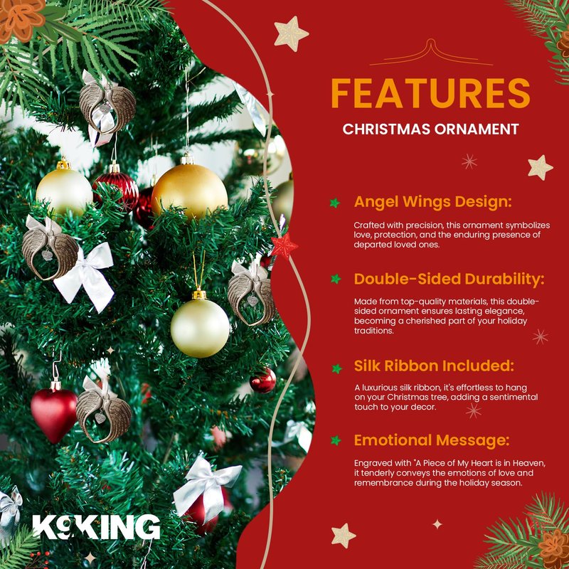 - βγπ¨π£ππ₯πππ π¬π’π¨π₯ πππ₯ππ¦π§π ππ¦γ: Decorate with an artistically crafted Christmas ornament, in the shape of angel wings, double sided, with the inspiring "A Piece of My Heart is in Heaven" inscription in the center. The antique design and striking adornments add depth and character, making your holiday setup truly stand out. Whether youβre looking to refresh your existing collection or starting new traditions, our ornaments are the perfect addition.