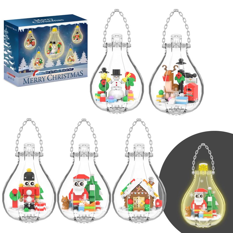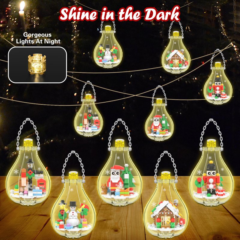 Wowok Christmas Themed Light-up Bulb Building Blocks Set Do you want to get some unique and meaningful christmas tree ornaments for christmas decor? Come here to look at this christmas ornaments with lights. We combine different Christmas theme items, restore their images with building blocks, and put them into transparent lamp shell. The lamp is built in light, and make it will glowing in the dark.