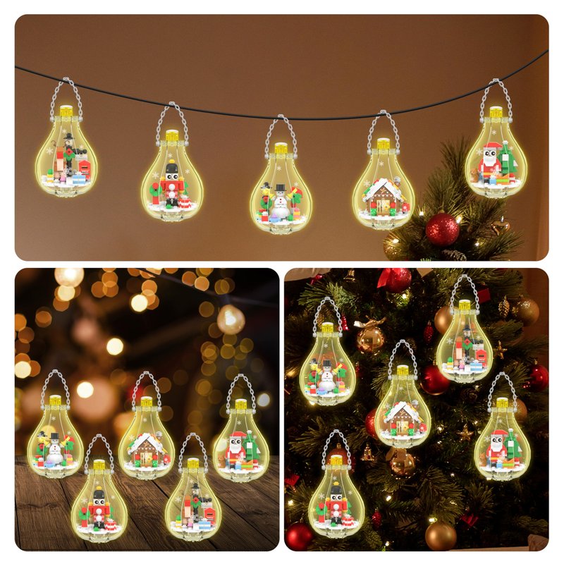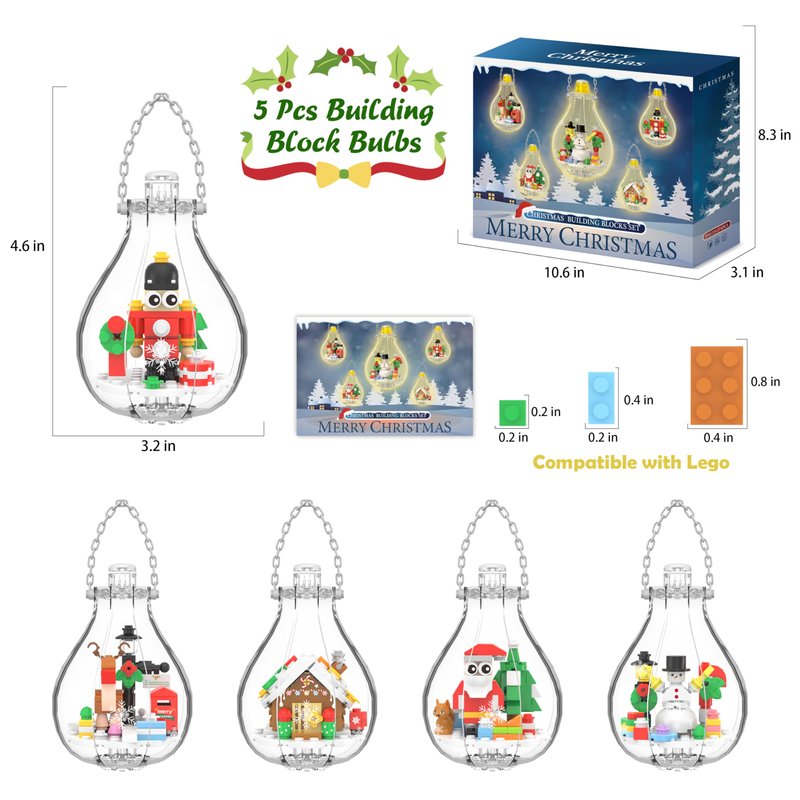 - 【Compatible with Lego Cute Christmas Tree Ornaments Bulbs】: New exclusive design christmas tree ornaments 2024 christmas building sets. Includes 5 packs of unique christmas themed bulb ornament. Reindeer, the Nutcrackers, Gingerbread House, Snowman and Santa Claus all are here. These cute Christmas ornaments built in a light bulb can be hung anywhere in your home to bring your home a strong Christmas holiday atmosphere