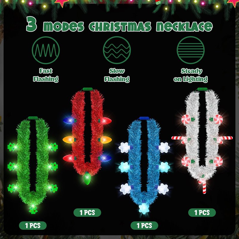 - What You Get - Four different styles of Christmas light necklaces are enough for you to use in different parties, adding light and fun to the party.