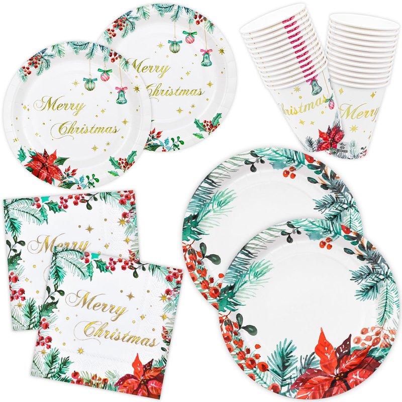 - Do you need some Christmas dinnerware for your guests? Our Christmas paper plates napkins paper and cups set are a great choice for your christmas party.