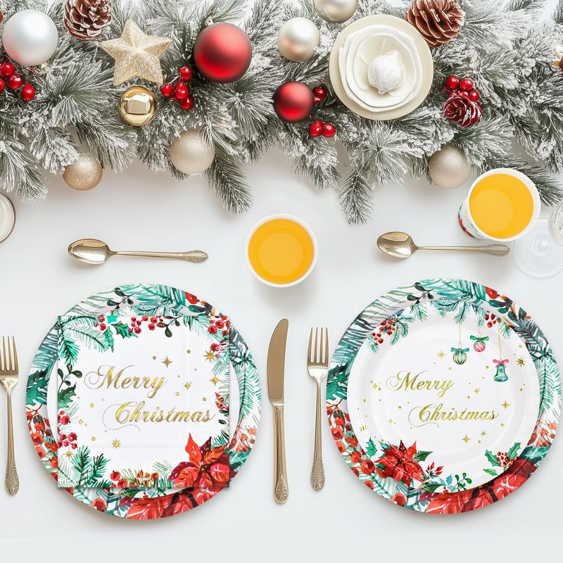 - Our Christmas dinnerware set disposable design add a delightful touch to your table setting, making it easy for you to create a fun and festive ambiance for your xmas party.