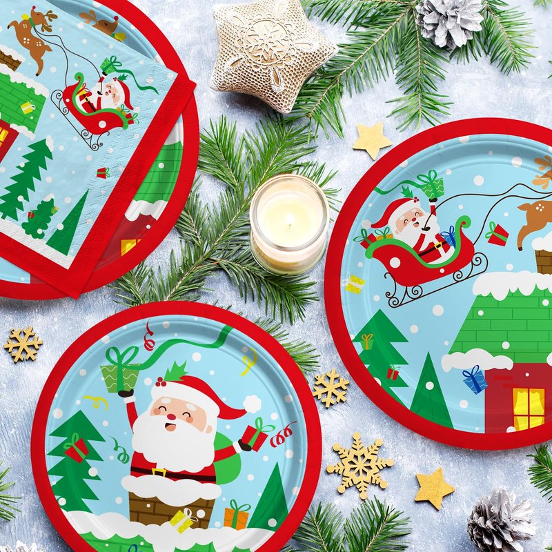 - Santa Holiday Design: This unique Christmas party decorations feature cheerfully printed images of Santa in his sleigh above vibrant winter scenes, perfect for both kids' enjoyment at home and school.
