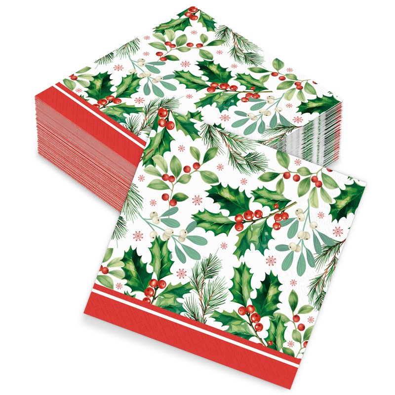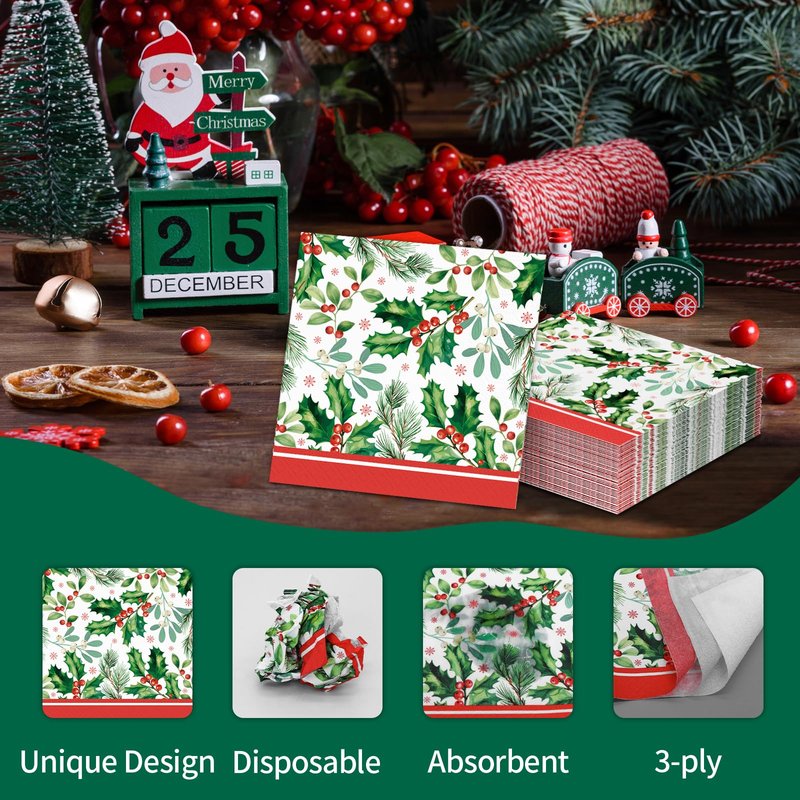 Christmas Party Supplies, Paper Napkins Disposable Luncheon Napkins Party Napkins for Merry Christmas Holly Jolly Christmas Holly Mistletoe Winter Holiday Party Decorations, 3 PLY, 50 Count