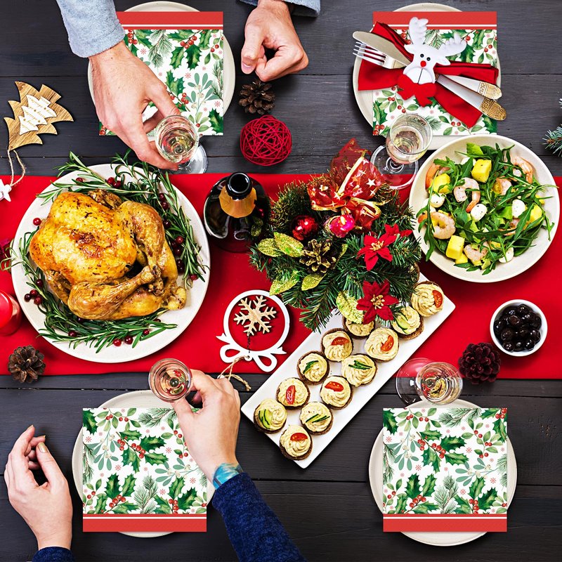 - 🎄【PREMIUM QUALITY & SAFETY】: This chic Christmas napkins are soft, absorbent and not easy to tear, environmentally friendly, BPA-Free, non-toxic. Keep the table clean and stain-free from spilled food, milk, juice, soda or wine.