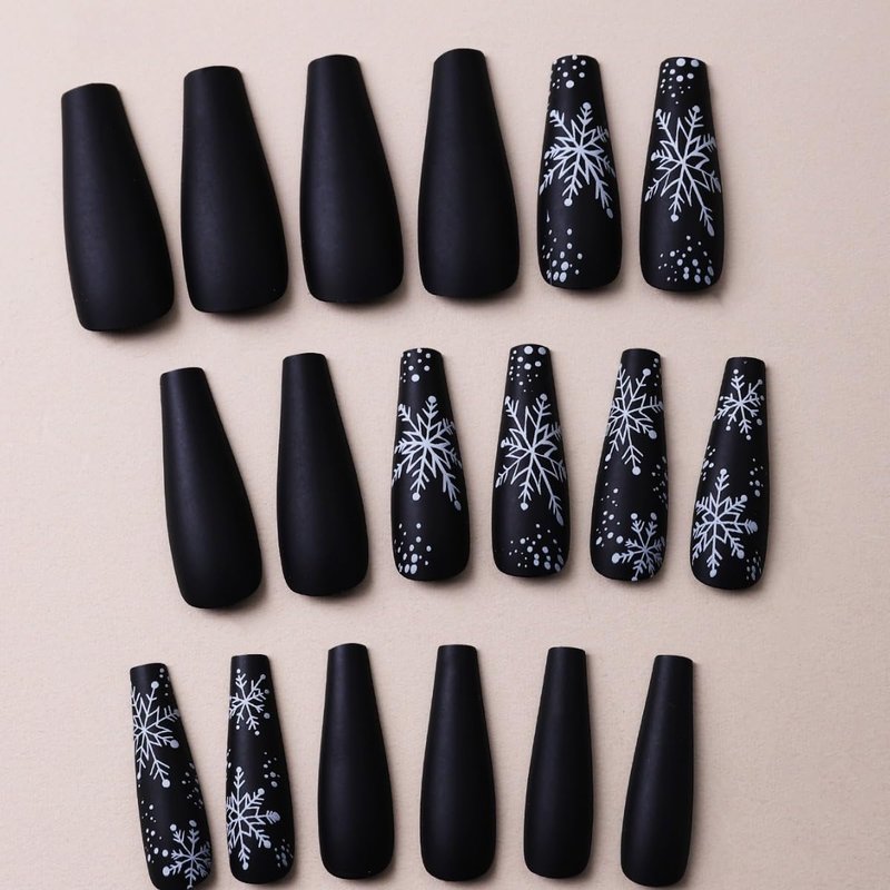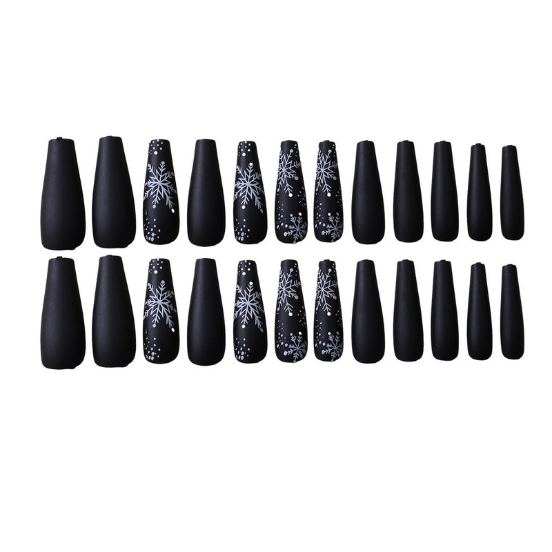 Christmas Press on Nails Long Coffin Fake Nails Black False Nails with Snowflake Design Glue on Nails Glossy Full Cover Stick on Nails Ballerina Acrylic Nails for Women Winter Manicure 24Pcs