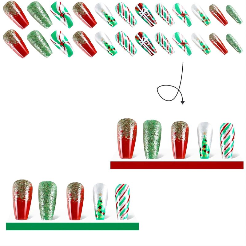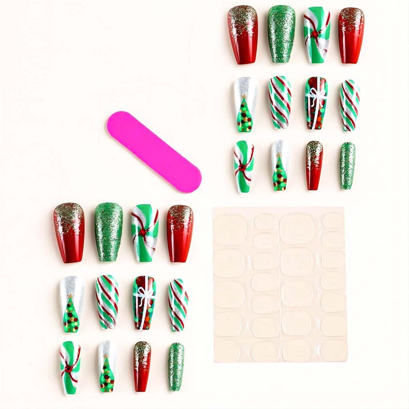 Christmas Press on Nails Medium Coffin Fake Nails Acrylic False Nails with Rhinestones Glitter Design Red Artificial Glue on Nails Green Xmas Tree Stick on Nails for Women 24Pcs