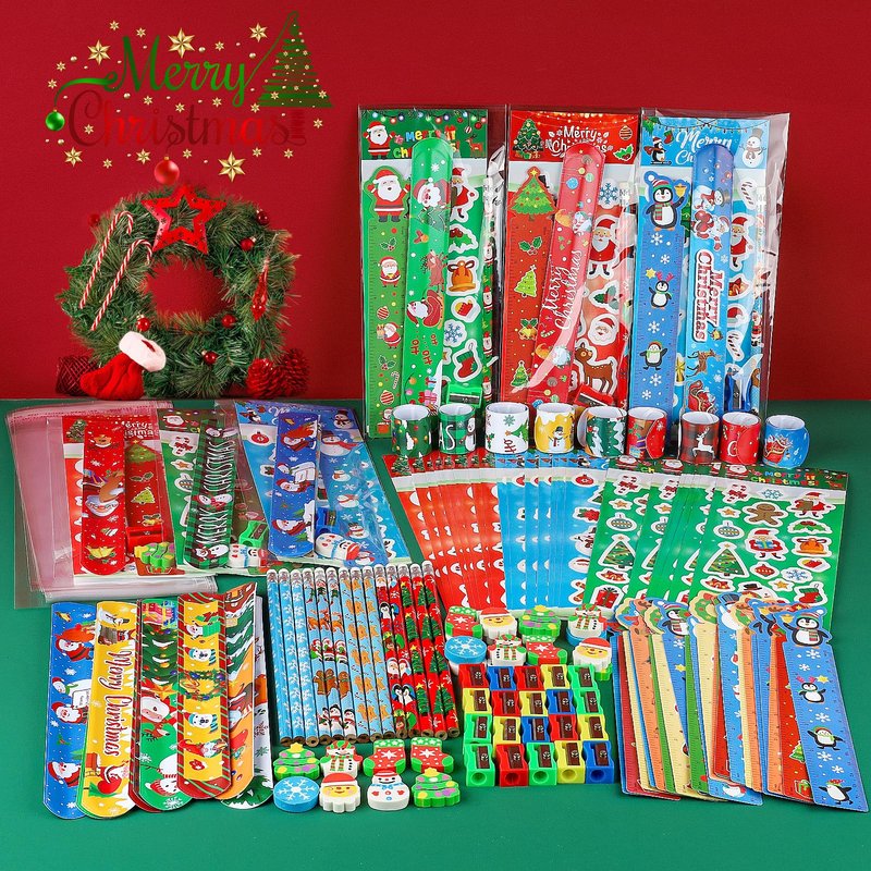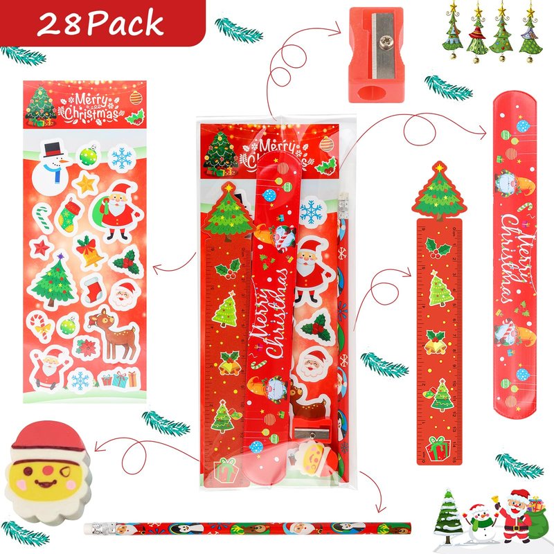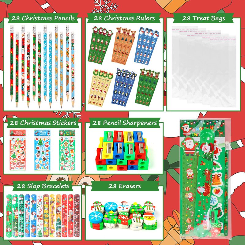 - 28Pack Christmas Party Favors Gifts: This 28-pack set includes a variety of Christmas stationery essentials: 28 Chrsitmas pencils, 28 Chrsitmas erasers, 28 Chrsitmas sharpeners, 28 Chrsitmas rulers, 28 Chrsitmas bracelets, and 28 Chrsitmas stickers and 28 Christmas gifts bags – everything your child needs for creative holiday fun at home, school, or during holiday gatherings.