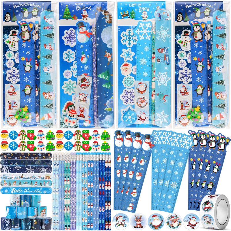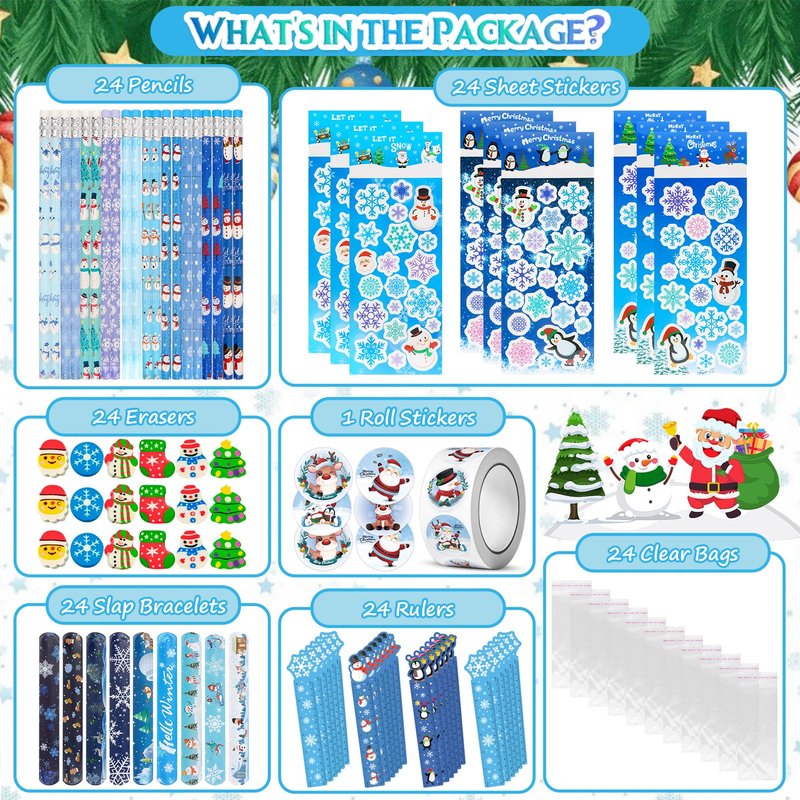 - Versatile & Fun Christmas Stationery Set: The whole set Includes 24 Christmas-themed pencils, 24 Christmas-shaped erasers, 24 Christmas snowflakes bracelets, 24 Christmas rules, 24 sheets of decorative stickers, 24 goodie bags and 1 rolls of holiday stickers. It’s a complete set for endless creative play, whether at home, in the classroom, or on the go!