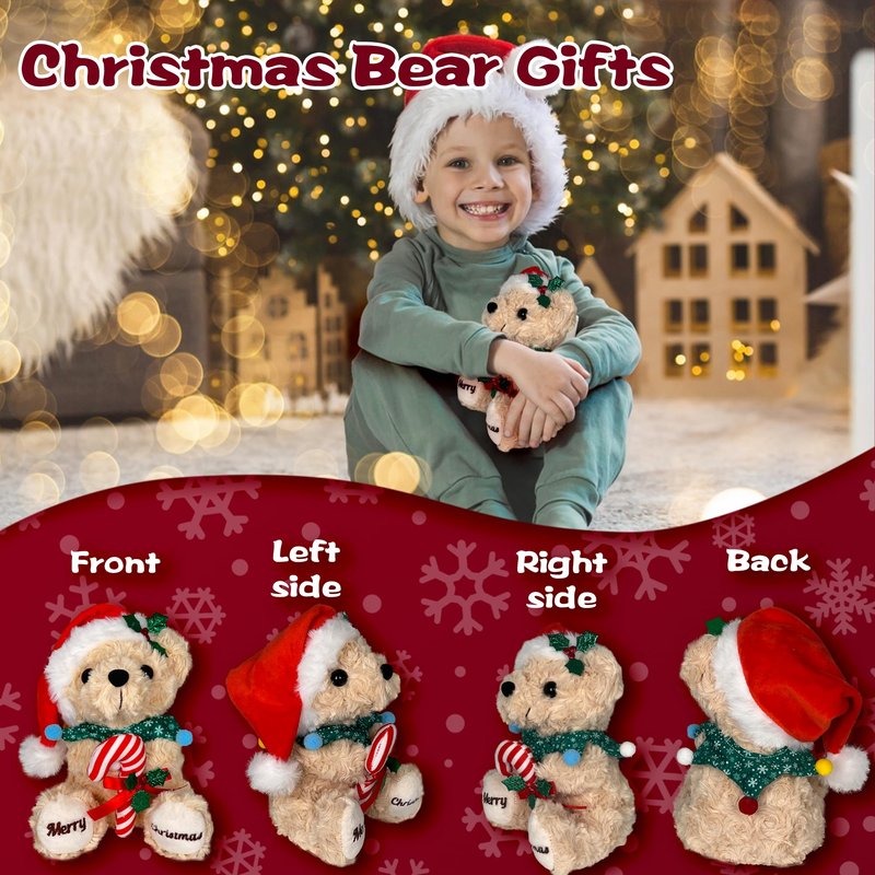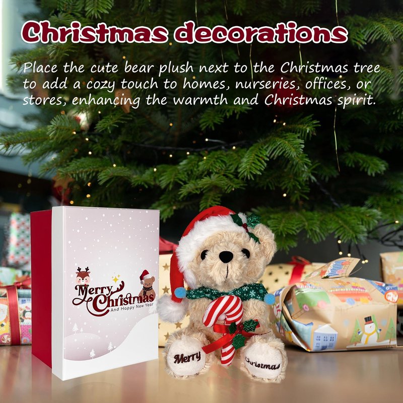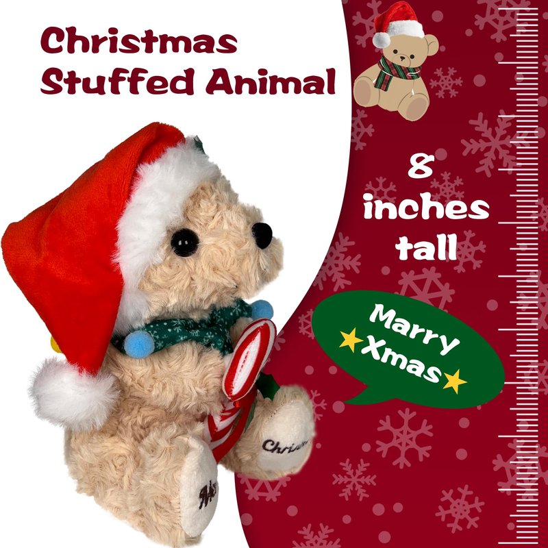 • Christmas Toy Teddy Bear - Our 8 inch cute festive plush bear is designed to celebrate Christmas holiday featuring an adorable red Santa hat, candy cane, and embroidered foot that reads "Merry Christmas." Adding a touch of festive cheer to any space.