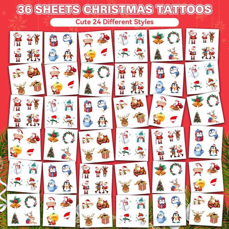 - [Christmas Decorations Tattoos]: Christmas tattoos temporary include santa claus, christmas tree, reindeer, snowman, penguin etc. classic Christmas pattern. Christmas tattoo stickers for kids are not just for skin–they’re perfect for decorating various smooth surfaces. Kids can stick them on glass cups, stationery, gift boxes etc.