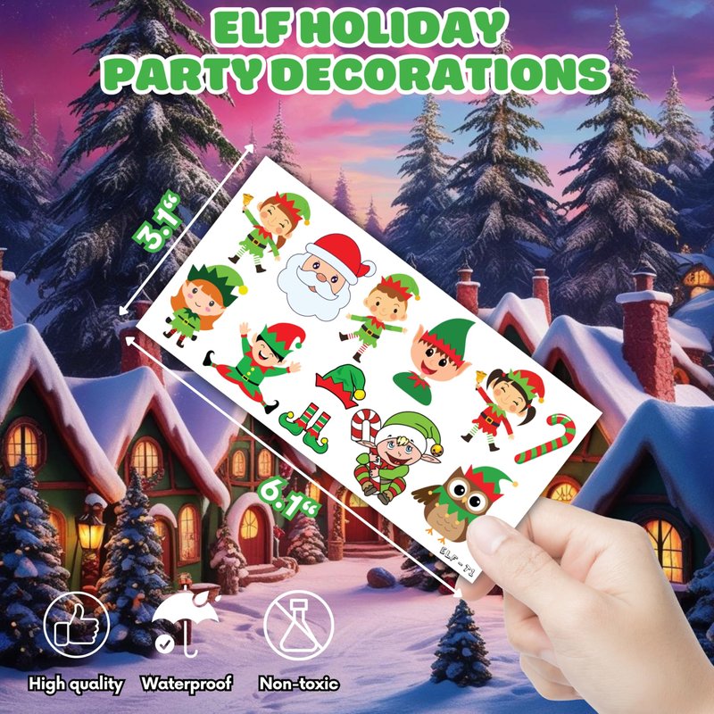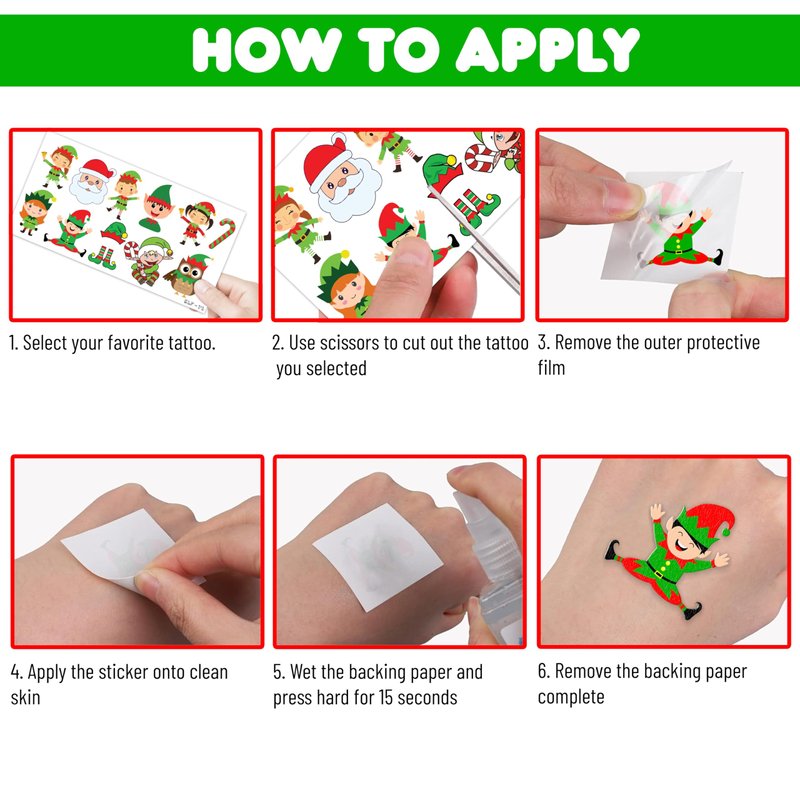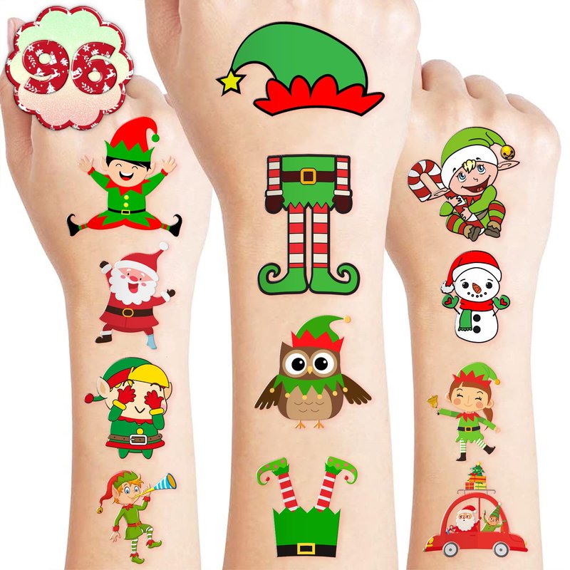 🎅【PERFECT TATTOOS FOR THEMED CHRISTMAS DECORATIONS】: Christmas temporary tattoo stickers include 8 sheets in total. There are 96Pcs super cute tattoo differences. Perfect for giving out party favors and holiday theme small gifts. The size of each sheet is 6.1 * 3.1 inches. One size fits kids. 🎁【GREAT GIFT IDEAS FOR CHRISTMAS PARTY SUPPLIES AND DECORATIONS】: You will receive many compliments when you decorate your child's birthday party with a Chistmas theme. Chistmas tattoos are a small gift you should not pass up for your kids. 🌍【SAFE AND ENVIRONMENTALLY CONSCIOUS】: Our temporary tattoos are made from materials that are safe and prioritize sustainability. These tattoos are created using paper that is both safe for users and friendly to the environment. 🥳【ADD A TOUCH OF FUN】: Are you tired of mundane gifts? We've got you covered! Our collection of adorable and vibrant temporary tattoo designs can be applied to laptops, backpacks, desks, suitcases, books, water cups, and more. These playful elements will surely elevate your visual experience and bring a touch of joy to everyday items. 🌴【EASY TO USE AND REMOVE】: Cut each tattoo out of sheets and remove the sheet clearly. You can stick it on hands, face, arms or wherever you feel safe. Moreover, you put it down on glasses, clothes, and a smooth flat . After that, you wet it thoroughly with water and wait for 20-30 seconds, you get rid of the backing paper. As a result, you have a velvety tattoo as we say. 👍【PERFECT SERVICE】: If you have difficulty using our product, contact us. We will make sure to solve problems and help you have a wonderful buying experience.⚠️This product is not recommended for individuals with sensitive skin. We advise testing the product on a small patch of skin, such as the hand, to check for any allergic reactions to the ingredients before applying it to other areas of the body