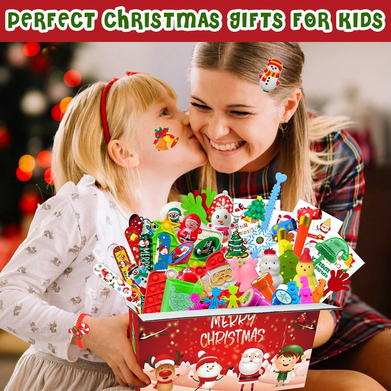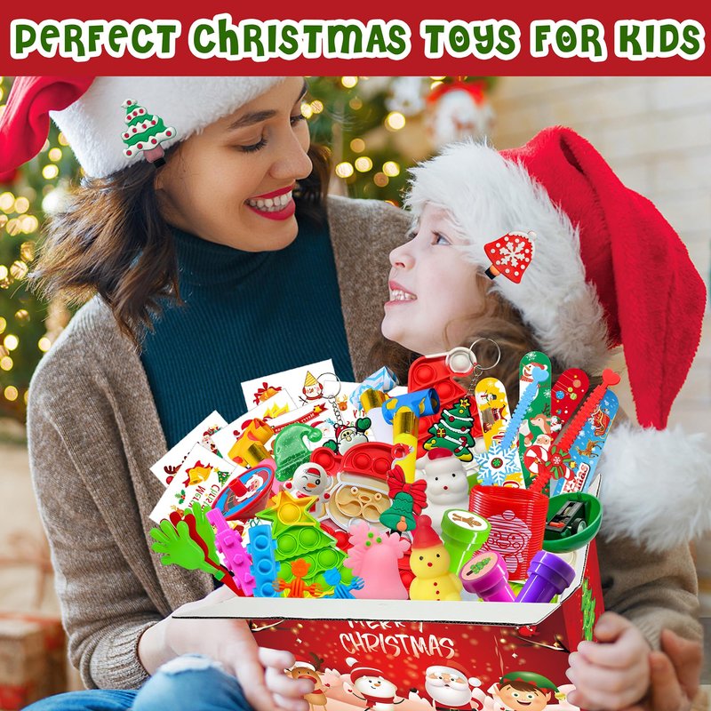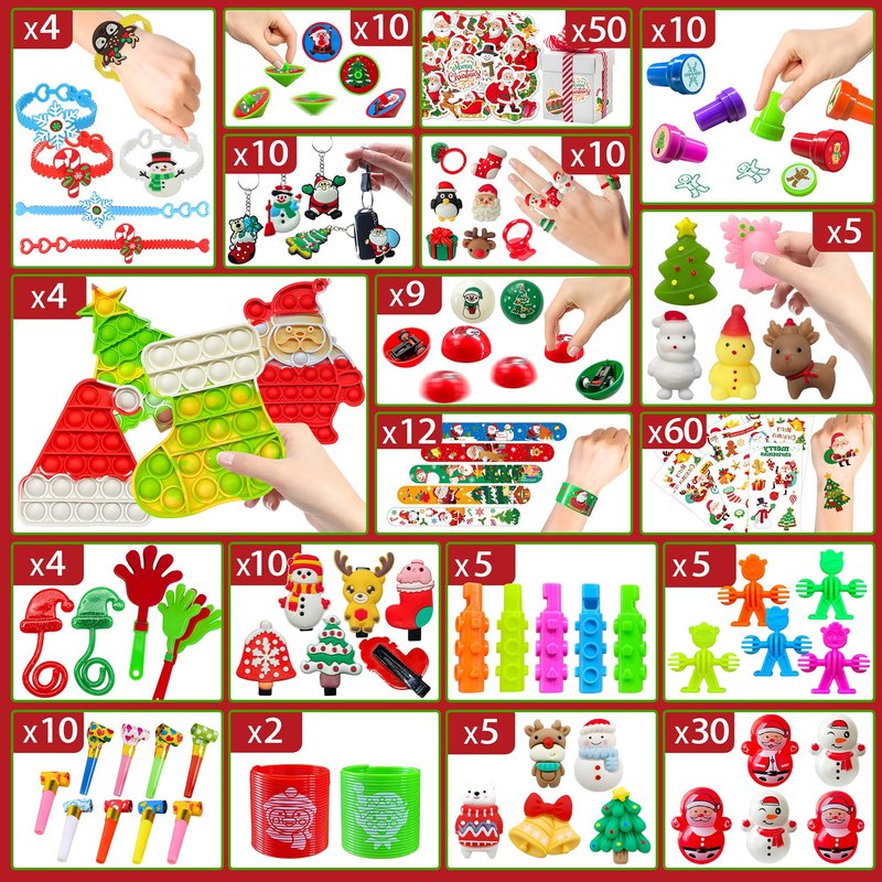 - Assortment Funny Christmas Toys: Indulge in the holiday spirit with our 250pcs Christmas toy sets! Inside a beautifully designed gift box, discover 20 different toys, including fidget poppers, bracelets, squishy characters, seals, keychains, rings, cars toys, spinning tops, Tumblers, blowing dragons, hairpins, plus Christmas stickers and tattoo stickers, etc. Enjoy A Joyful Christmas: Unwrap the Magic with Our 250pcs Christmas Toy Set